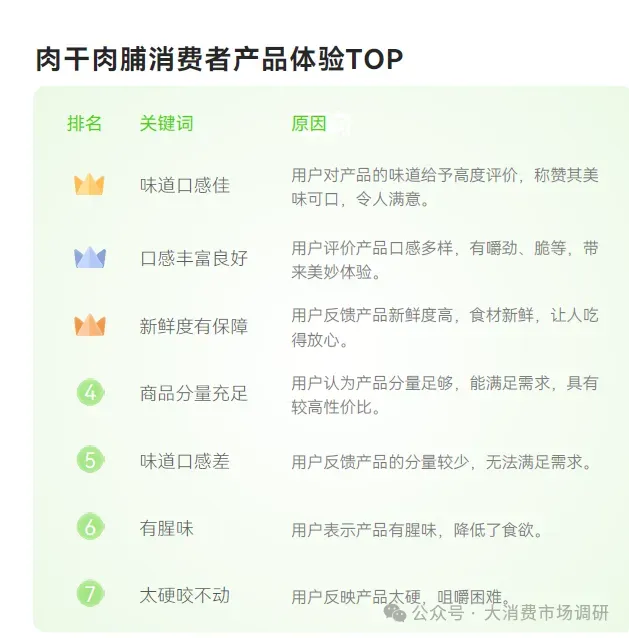 肉干肉脯消费场景丰富多元,追剧、解馋等日常场景,与 饮酒、送礼等特色场景并存,覆盖休闲、社交、健康等需求。产品体验端,“味道口感佳”“口感丰富”等正向反馈成复购驱动力,而“味道口感差”“太硬咬不动”等负向体验则影响消费决策。品牌需围绕多元场景定制产品,强化口味、口感优势同时优化品控,借体验口碑夯实消费根基,