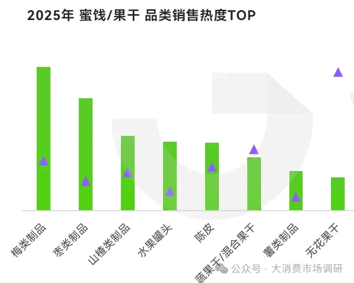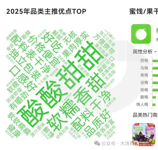 从蜜饯/果千品类主推优点来看,“酸甜“软糯”等口感与“配料干净”等品质热度较高。以梅类、枣类、山楂制品三大热门细分品类来看,西梅、新疆若羌灰枣、山楂干等细分品表现突出、并借“无添加”“养生”等卖点、精准触达消费需求。品牌可围绕酸甜核心口感,深化细分市场特色,以多元产品矩阵巩固品类市场。