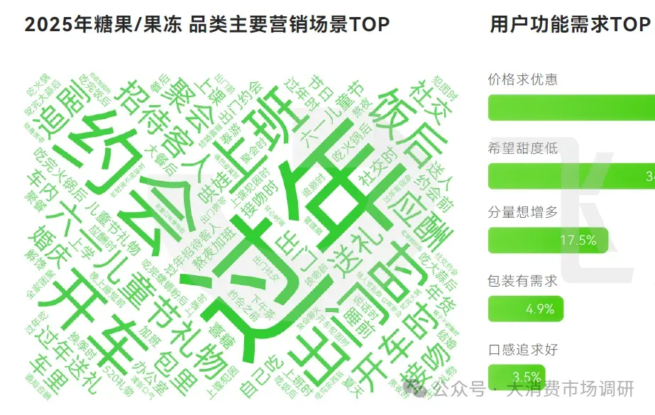 2025 年糖果 / 果冻品类,营销场景围绕 “过年”“聚会”“送礼” 等节日社交展开,借情感共鸣触达消费者。用户功能需求聚焦 “价格优惠”“甜度低”,反映健康、性价比追求。其中“茶口乐茶叶含片“爆款突围,借助多维场景锚定口腔问题,通过场景构建、体验对比强化功效,契合品类营销趋势。品牌可深耕节日社交场景,响应健康、性价比需求,借场景化营销与功能创新提升竞争力。