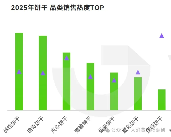 2025年饼干细分市场中,酥性、曲奇等传统饼干销售热度领先,筑牢市场根基。压缩饼干表现突出,凭借以“饱腹”“户外”“代餐”等功能场景卖点,契合特定消费需求。品牌可巩固传统饼干优势,借压缩饼干功能化、场景化特色,挖掘户外、代餐等细分市场增长空间。