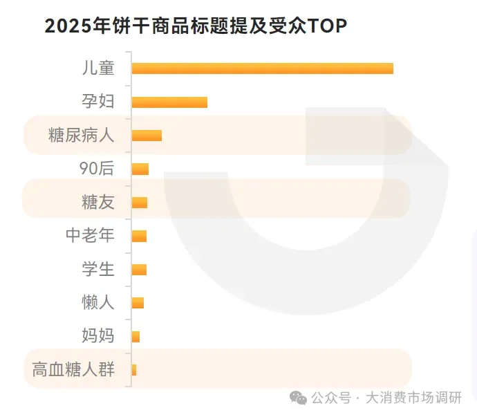 2025年饼干品类中,无糖饼干销售额占比 11.26% ,其标题聚焦“代餐”“健康”“高钙”等卖点。受众覆盖儿童、孕妇、糖尿病人等特殊群体,借“0 蔗糖”“无添加”标签,契合健康消费需求。江中猴姑、全麦谷物饼干等代表商品销售热度高,品牌通过精准锚定特殊人群,强化无糖、健康属性,挖掘饼干品类细分增长空间。