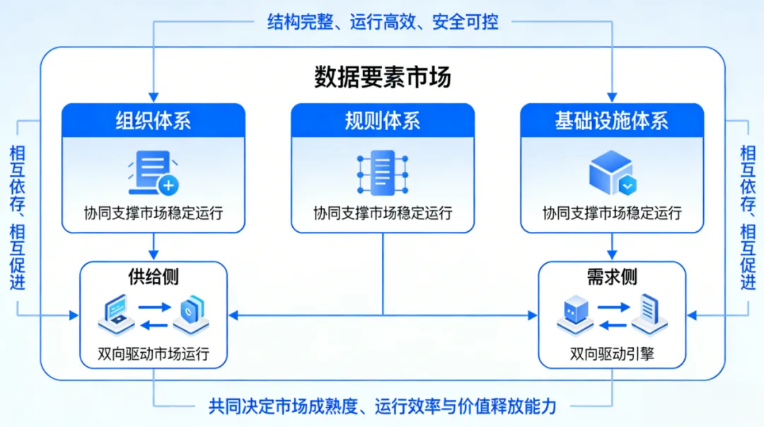 数据要素市场是一个结构复杂、主体多元、规则严密、支撑完备的有机系统,其稳定运行依赖于组织体系、规则体系、基础设施体系三大支柱的协同支撑,同时以供给侧与需求侧作为双向驱动引擎,形成结构完整、运行高效、安全可控的市场整体。三大体系相互依存、相互促进,共同决定数据要素市场的成熟度、运行效率与价值释放能力,是理解数据要素市场内在逻辑的核心框架。