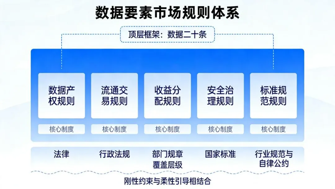 规则体系是数据要素市场的“运行准绳”,是保障市场公平、高效、安全、有序运行的制度基础,也是数据要素实现市场化配置的核心前提。数据要素的特殊性决定了其必须建立一套覆盖全生命周期、多元主体协同的系统化规则体系,而无法依靠单一制度或自发秩序实现有效运行。我国数据要素市场规则体系以“数据二十条”为顶层框架,形成以数据产权规则、流通交易规则、收益分配规则、安全治理规则、标准规范规则为核心的“五位一体”制度架构,覆盖法律、行政法规、部门规章、国家标准、行业规范与自律公约多个层级,实现刚性约束与柔性引导相结合。