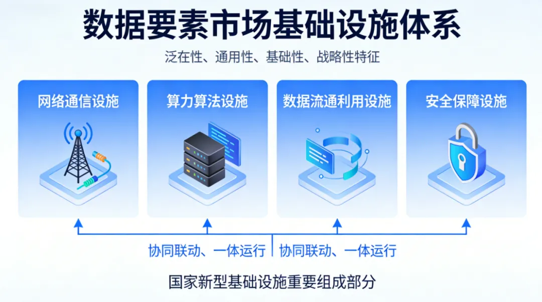 基础设施体系是数据要素市场的“硬件底座”,为数据要素全生命周期运行提供物理支撑、技术支撑与环境支撑,是数据要素实现高效采集、稳定传输、弹性计算、可信流通、安全应用的物质基础。数据要素市场基础设施具有泛在性、通用性、基础性、战略性特征,与传统交通、能源等基础设施一样,属于国家新型基础设施的重要组成部分。按照功能定位,数据要素市场基础设施体系主要分为网络通信设施、算力算法设施、数据流通利用设施、安全保障设施等四大类,四类设施协同联动、一体运行,共同构成数据要素市场的坚实底座。