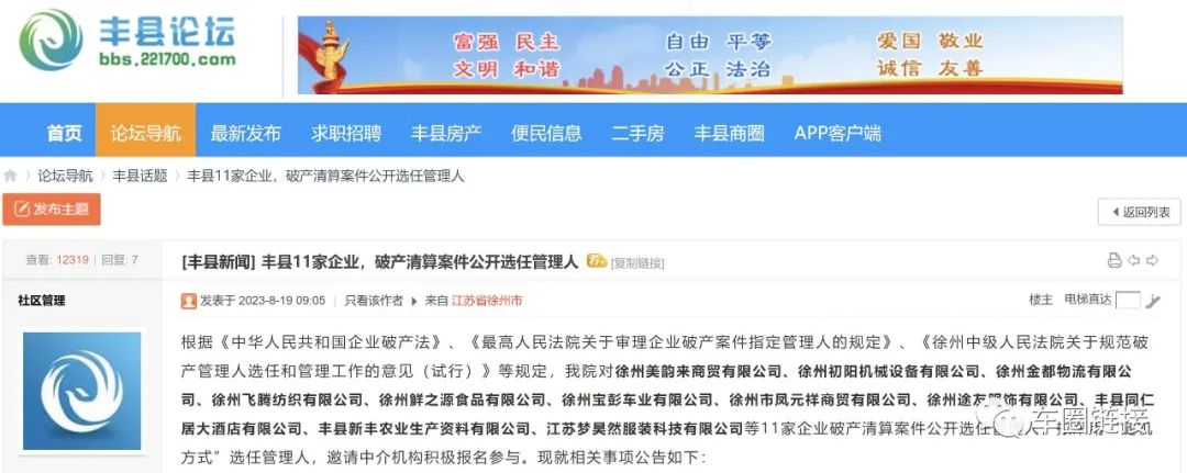 近日,丰县论坛发布了一则消息:《丰县11家企业,破产清算案件公开选任管理人》中徐州宝彭车业有限公司被列入其中。