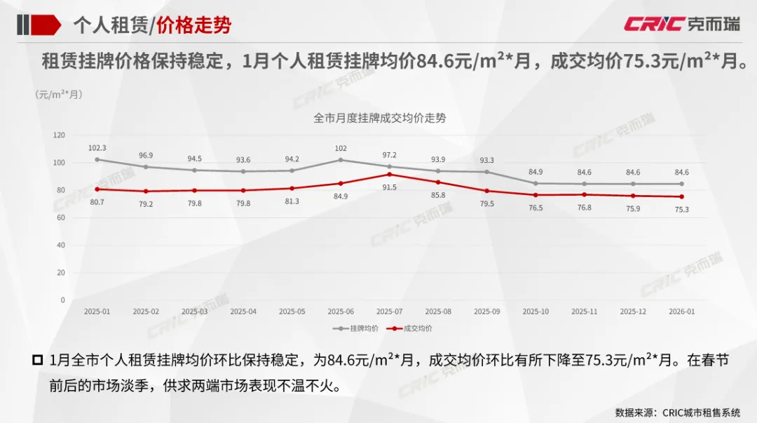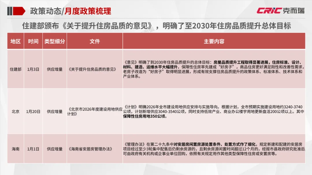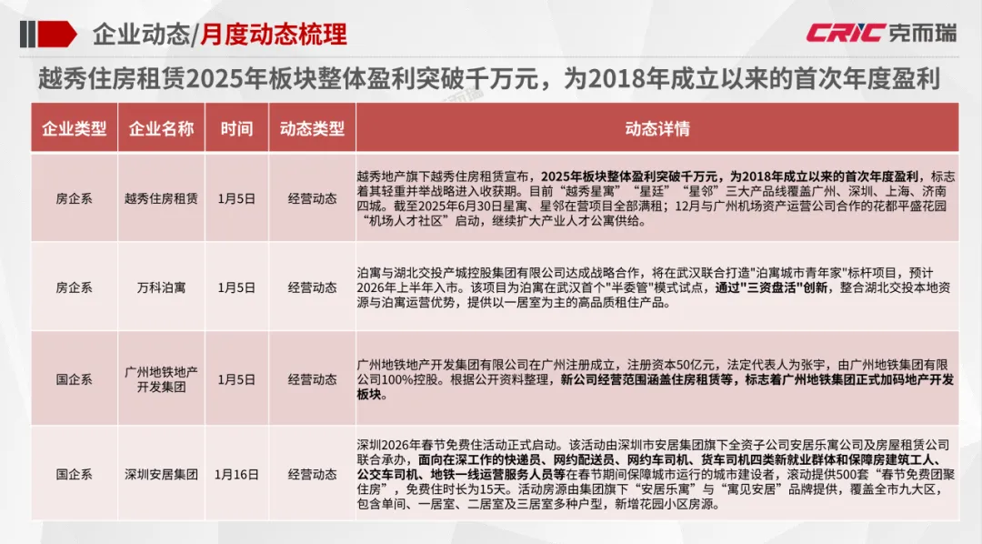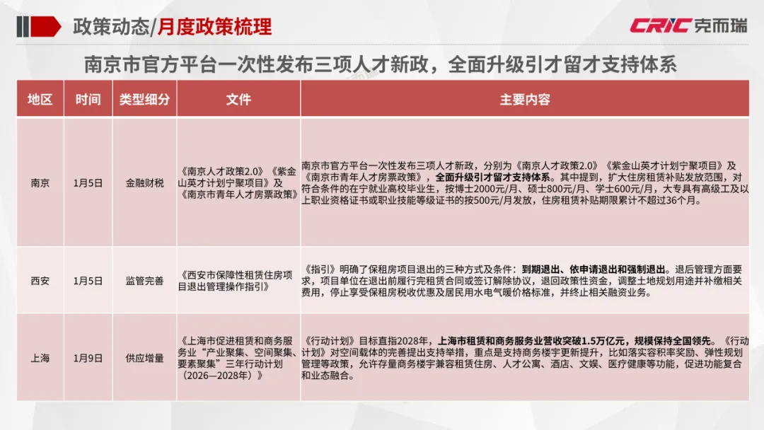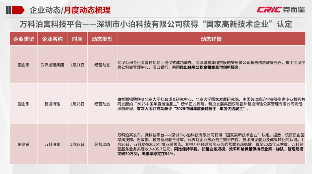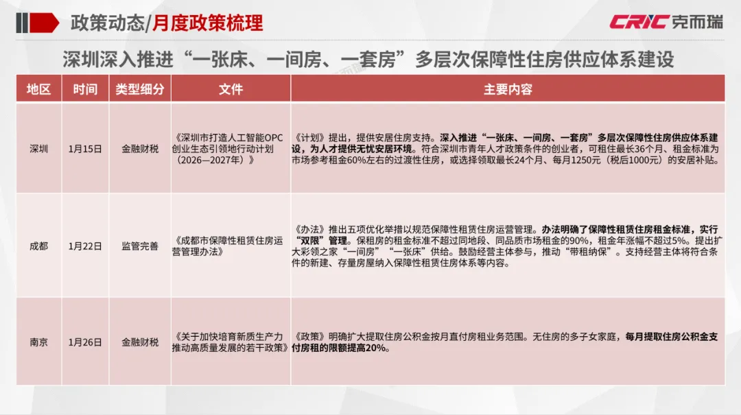 政策动态:住建部颁布《关于提升住房品质的意见》,明确了至2030年住房品质提升总体目标;南京市官方平台一次性发布三项人才新政,全面升级引才留才支持体系;深圳深入推进“一张床、一间房、一套房”多层次保障性住房供应体系建设。企业动态:越秀住房租赁2025年板块整体盈利突破千万元,为2018年成立以来的首次年度盈利;万科泊寓科技平台——深圳市小泊科技有限公司获得“国家高新技术企业”认定。市场监测:个人租赁全市租金较上月下降0.8%,挂牌量较上月下降10.8%,成交量上涨8.6%;全市集中式公寓1月在开业项目数量为401个,房源总数相比上月保持平稳。住建部颁布《关于提升住房品质的意见》,《意见》明确了到2030年住房品质提升的总体目标:房屋品质提升工程取得显著进展,住房标准、设计、材料、建造、运维水平大幅提升,保障性住房率先建成“好房子”,商品住房更好满足刚性和改善性需求,老房子改造为“好房子”取得明显进展,形成有效支撑住房品质提升的政策体系、标准体系、技术体系和产业体系。此外,北京发布《北京市2026年度建设用地供应计划》。《计划》明确2026年全市建设用地供应安排与实施导向。根据计划,全市预期实施建设用地约3240-3740公顷,计划新增供应3040-3540公顷,同时支持低效产业、商业办公楼宇用地更新盘活200公顷以上。其中保障性住房用地350公顷。越秀地产旗下越秀住房租赁宣布,2025年板块整体盈利突破千万元,为2018年成立以来的首次年度盈利,标志着其轻重并举战略进入收获期。目前“越秀星寓”“星廷”“星邻”三大产品线覆盖广州、深圳、上海、济南四城。截至2025年6月30日星寓、星邻在营项目全部满租;12月与广州机场资产运营公司合作的花都平盛花园“机场人才社区”启动,继续扩大产业人才公寓供给。万科泊寓发布,其科技平台——深圳市小泊科技有限公司获得“国家高新技术企业”认定。据悉,该资质由国家科技部、财政部、税务总局联合评审,代表对企业核心自主知识产权、技术研发能力及成果转化的认可。1月30日,万科发布2025年度业绩预告。其中万科经营服务业务的营收表现稳健。截至2025年三季度,万科经营服务业务实现收入435.7亿元,同比保持平稳,长租业务规模、效率和纳保量保持行业第一梯队,管理规模突破20万间,出租率稳定在94%。个人租赁:1月全市租金较上月稳中略降,各区域租金涨跌互现,涨幅最大的是东城区;1月全市个人租赁挂牌量持续回落,成交量有所上涨,各区域成交挂牌比普遍上涨;租赁挂牌价格保持稳定,1月个人租赁挂牌均价84.6元/m²*月,成交均价75.3元/m²*月。