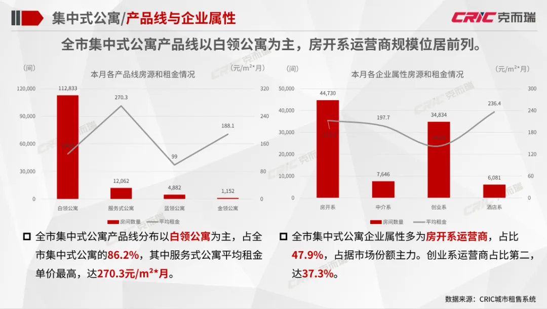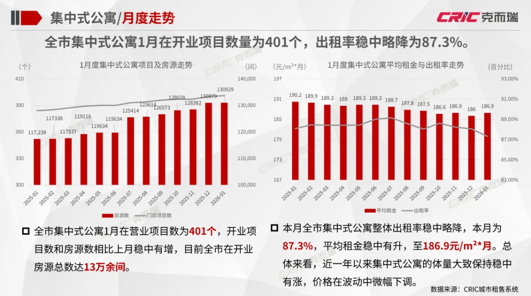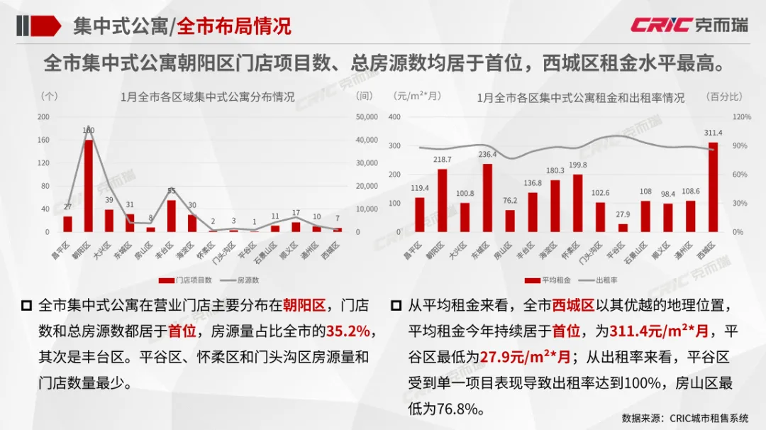 集中式公寓:全市集中式公寓1月在开业项目数量为401个,出租率稳中略降为87.3%;全市集中式公寓朝阳区门店项目数、总房源数均居于首位,西城区租金水平最高;全市集中式公寓产品线以白领公寓为主,房开系运营商规模位居前列。