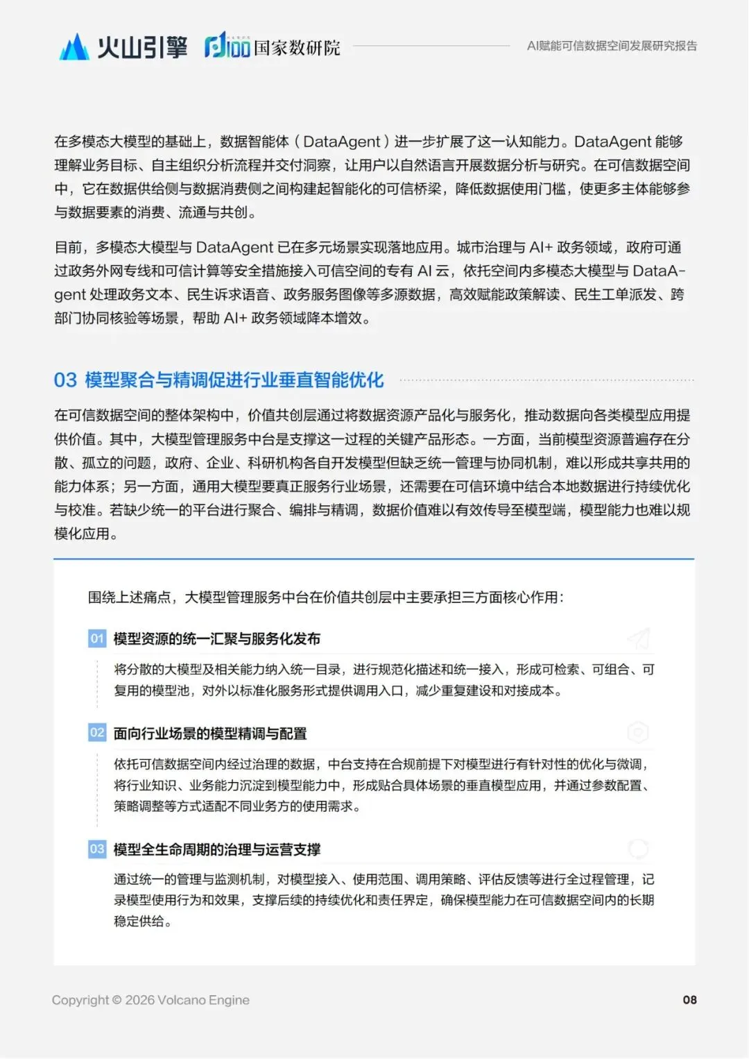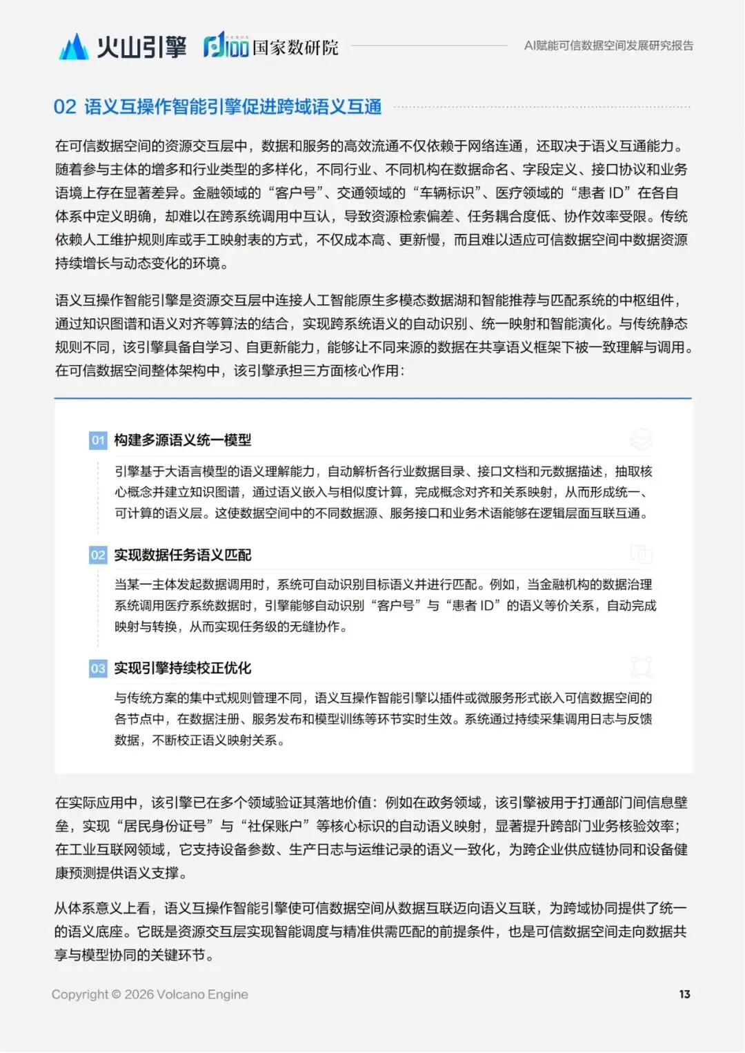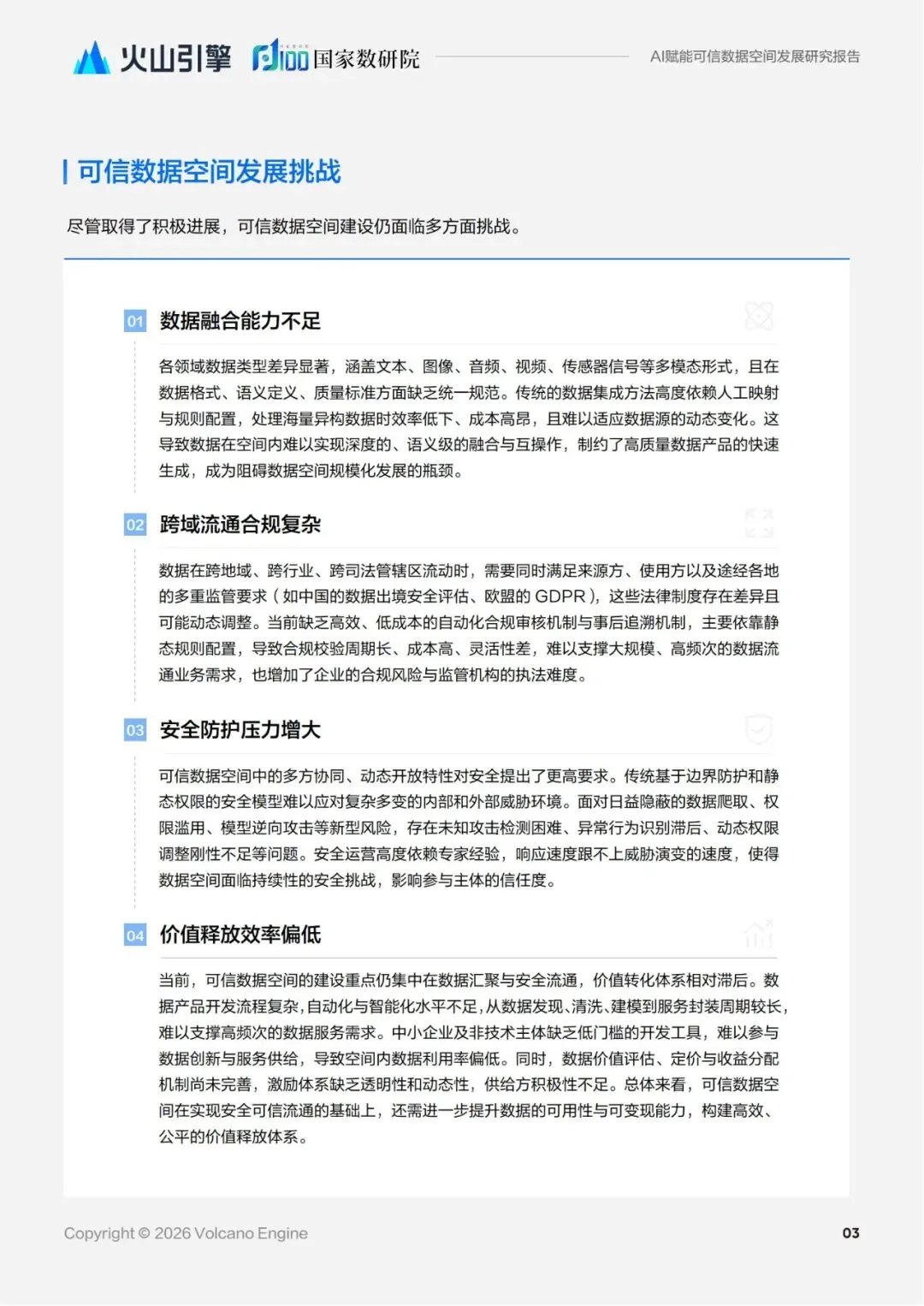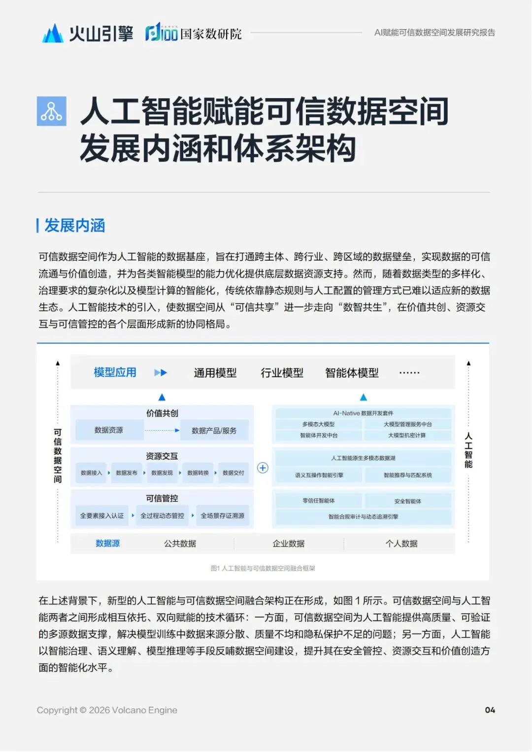 而人工智能凭借 其跨模态理解、自主决策、协同优化等能力,正从价值共创的生态化构建、数据资源的智能化交互、可信 管控的动态化平衡等多个维度,为可信数据空间注入新的活力。从多模态大模型打破数据壁垒,到安全智 能体实现实时风险预警,再到低代码开发平台降低数据产品创新门槛,人工智能正在重新定义数据治理的 范式,推动可信数据空间从“合规底线”向“价值高线”跃升,最终实现数据要素的安全流通与高效利用, 为数字经济的可持续发展提供强大支撑。