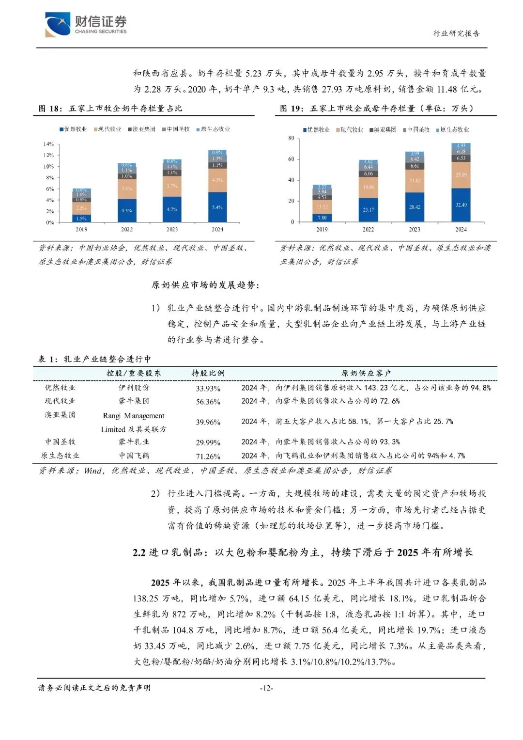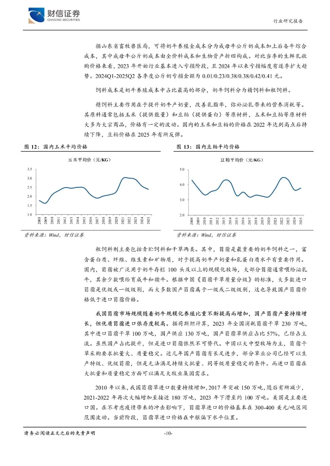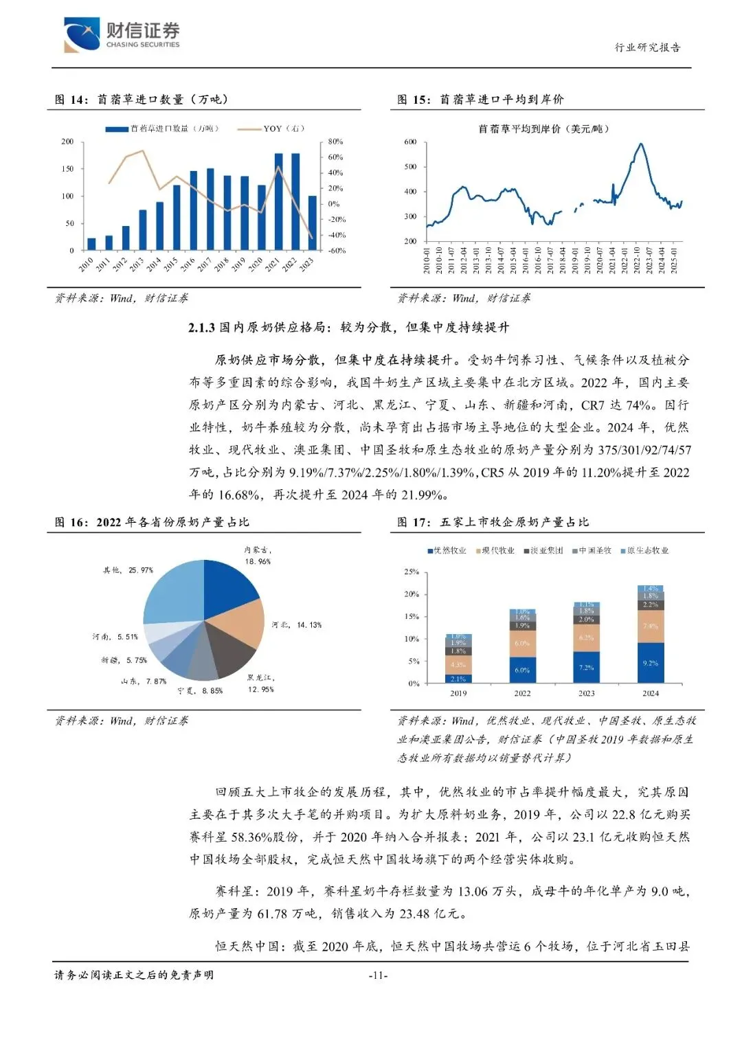 供给端:国内原奶供应环节,过去经历了十年快速高质量量的发展阶段,市场集中度相对分散,但规模化养殖的趋势明显:国内制品制造环节,市场集中度较高,液态奶双寡头竞争格局形成,其余精深加工的细分赛道则处于多方竞争状态;进口乳制品则主要分为大包:粉和干乳制品,其中,国外大包粉对我国原奶供应是一个强有力的补充,且国外大包粉大部分时间阶段属于物美价廉,但当前价格已经经倒挂,干乳制品则主要包括婴配粉、奶酪和黄油等产品。