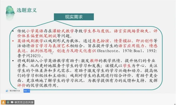 在教育改革不断深化、核心素养培养成为育人核心目标的背景下,小学英语教学亟需创新路径与实践模式。2025 年 10 月 24 日,“单芳芳小学英语名师工作室” 以线上会议形式,隆重召开 “基于核心素养下的小学英语教育戏剧教学实施策略与实践研究路径” 开题报告会。工作室十五位成员齐聚云端,共同开启小学英语教育戏剧研究的新征程。