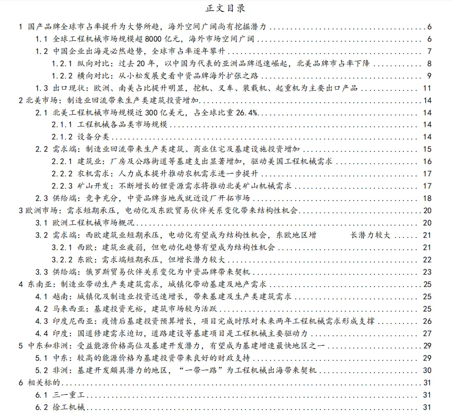 《2023工程机械出海市场发展潜力分析报告》 指出,全球工程机械市场规模超8000亿元,海外市场空间广阔。北美制造业回流带动需求,欧洲电动化成结构性机会,东南亚城镇化驱动基建需求,中东非洲受益能源价格高位。三一重工、徐工机械海外营收占比持续提升。