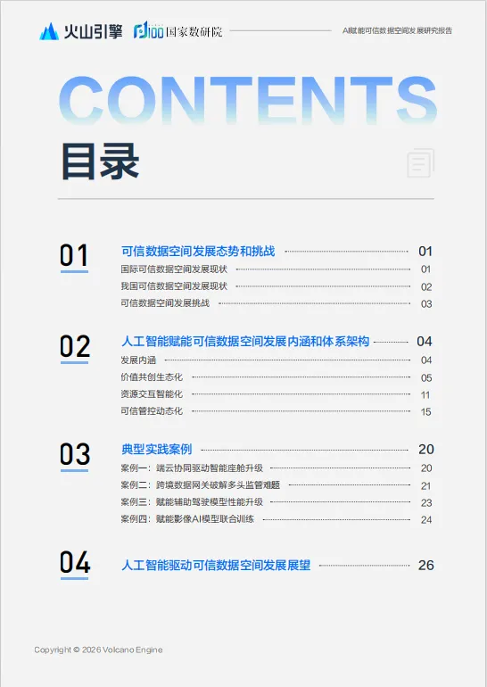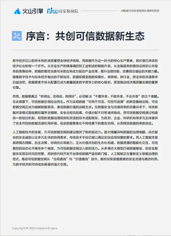 报告系统阐述了人工智能在可信数据空间建设中的关键赋能作用,全面分析国内外可信数据空间的发展现状和面临挑战,提出“价值共创生态化-资源交互智能化-可信管控动态化”的人工智能赋能可信数据空间发展内涵和体系架构。报告结合多个典型场景案例,为人工智能推动可信数据空间从“合规底线”向“价值高线”跃升提供可借鉴的实践指引。