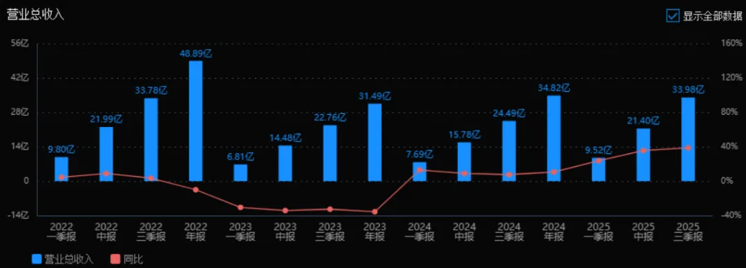 1)营业总收入:2025年三季报营业总收入为 33.98亿元,相较于2024年三季报的 24.49亿元,增长了 38.71%。评价:营业收入增长明显提速,增速从2024年的个位数跃升至近40%,表明公司业务扩张能力增强,市场需求旺盛,经营规模持续扩大。