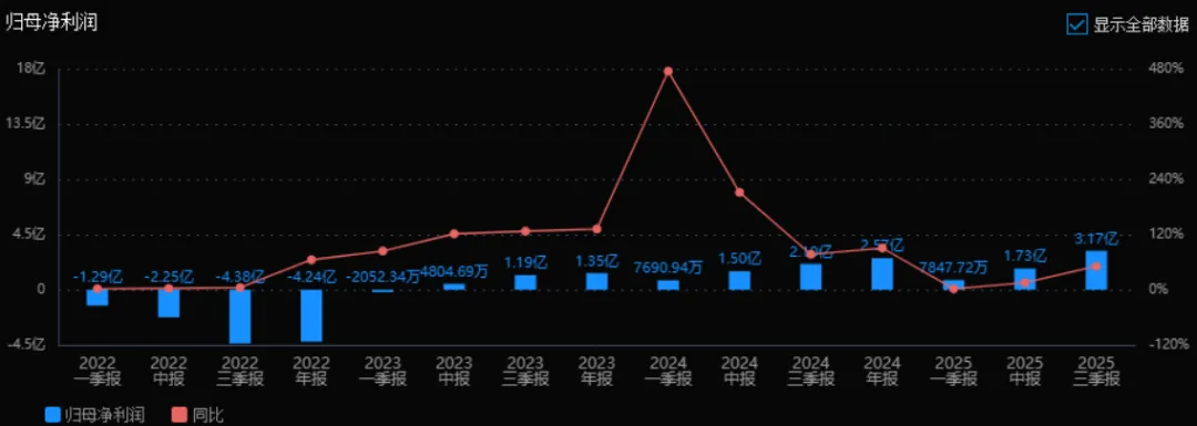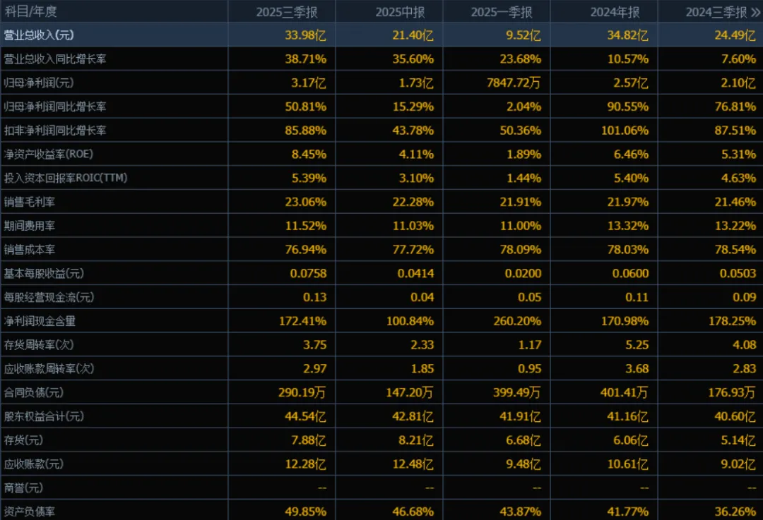 2)归母净利润:2025年三季报归母净利润为 3.17亿元,相较于2024年三季报的 2.10亿元,增长了 50.81%。评价:净利润增速显著高于收入增速,说明公司盈利能力提升,可能得益于成本控制、产品结构优化或规模效应显现。