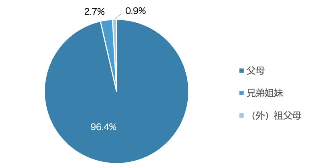 在照顾者与受照顾者的关系方面,绝大多数(96.4%)的照顾者是受照顾者的父母,此外还有少部分是兄弟姐妹(2.7%)和(外)祖父母(0.9%)。20.6%的照顾者没有任何其他人协助提供照顾。55.5%的照顾者除了受照顾者之外还有其他人需要照顾(即双重乃至多重照护者)。64.2%的照顾者因履行照顾责任而对工作进行过调整。