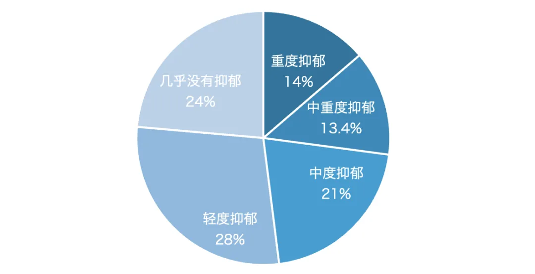 本调查发现,存在中度以上抑郁症状的照顾者占到47.7%,具体而言:存在重度抑郁症状的照顾者有13.7%;存在中重度抑郁症状的照顾者有13.4%;存在中度抑郁症状的照顾者有20.9%;存在轻度抑郁症状的照顾者有28.4%;只有23.6%的照顾者几乎没有抑郁症状。