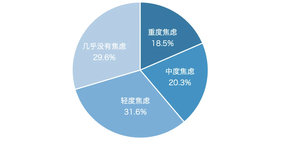 本调查发现,存在中度以上焦虑症状的照顾者占到38.8%,具体而言:存在重度焦虑症状的照顾者有18.5%;存在中度焦虑症状的照顾者有20.3%;存在轻度焦虑症状的照顾者有31.6%;只有29.6%的照顾者几乎没有焦虑症状。