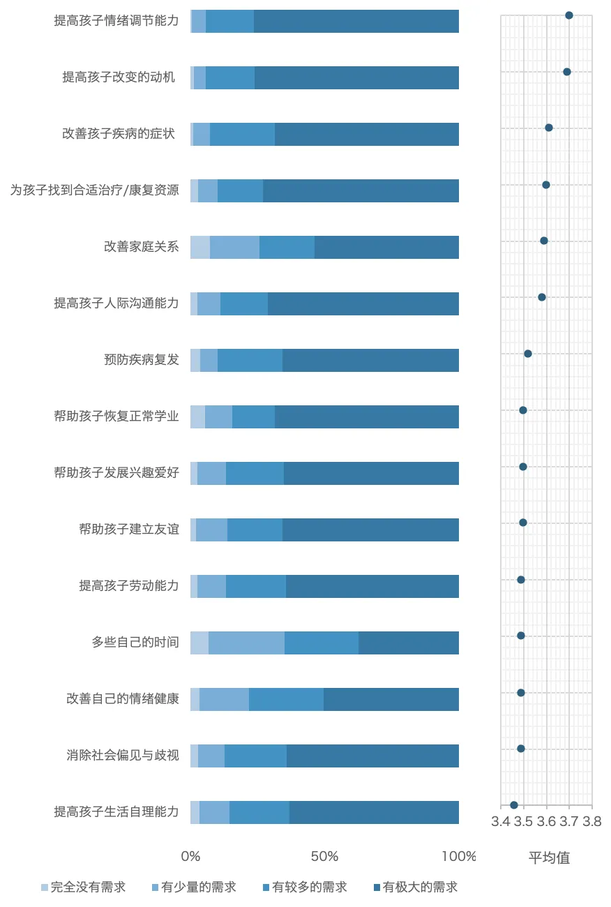 具体来看,得分最高的前五项需求依次为:提高孩子情绪调节能力、提高孩子改变动机、改善孩子疾病症状、为孩子找到合适治疗/康复资源、改善家庭关系,表明照顾者当前最迫切的关注点集中在孩子的能力提升与问题缓解层面,同时也反映了照顾者期待家庭内部关系得到修复与改善。