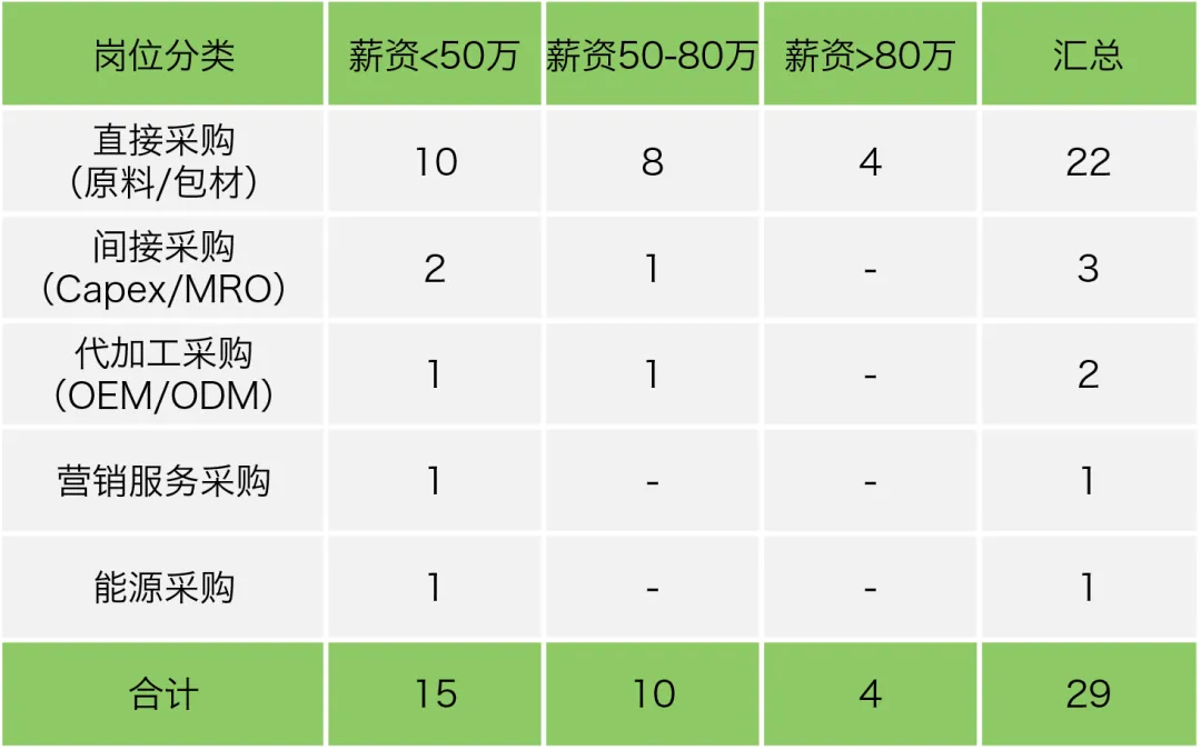 直接采购岗位占比高达75.8%(22 个),是市场需求的绝对主力。当前市场上活跃的人才(多为稳定5年 +、因组织架构扁平导致内部晋升/转岗受限的候选人),其能力模型已与企业招聘需求出现错配。企业更青睐熟悉全产业链、能深度参与业务战略决策的复合型采购人才,而非传统的执行型采购。