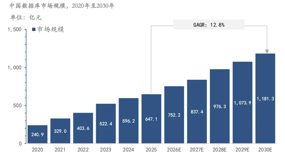 2024年中国数据库市场规模达到596.2亿 元。从2020年至2030年,整体市场规模预 计将从240.9亿元增长至1,181.3亿元,年复 合增长率(CAGR)达17.2%。其中,其 中,2025年至2030年仍将保持12.8%的年 复合增长率,表明市场已进入稳健扩张 阶段,需求结构日趋成熟,行业应用持 续深化。