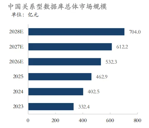 近年来,中国关系型数据库市场进入加速跃迁期,不仅保持规模扩张,更呈现出技术升级、生态重塑与行业渗透同步深化的特点。 2023–2028年市场规模将从332.4亿元增长至 704.0亿元,复合增速高达16.2%。这一高速增 长并非简单的需求放大,而是源于国产数据 库快速成熟、关键行业应用渗透提速以及云 原生架构逐渐落地所带来的动力。 中国关系型数据库市场正从“基础设施补齐” 阶段迈向“高端能力突破”阶段,其增长曲 线也开始反映出本土技术体系崛起的战略性 转折点。