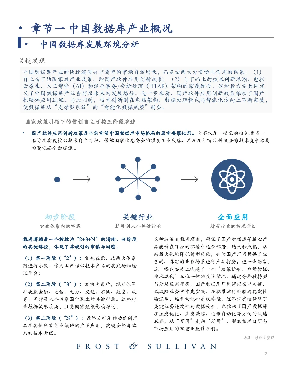 中国数据库产业的快速演进并非简单的市场自然增长,而是由两大力量协同作用的结果:(1) 自上而下的国家级产业政策,即国产软件应用创新政策;(2)自下而上的技术创新浪潮,包括 云原生、人工智能(AI)和混合事务/分析处理(HTAP)架构的深度融合。这两股力量共同定 义了中国数据库产业当前及未来的发展路径。进一步来看,国产软件应用创新政策推动了国产 软硬件应用进程。与此同时,技术创新则在底层架构、数据处理模式与智能化方向上不断突破, 使数据库从“支撑型系统”向“智能化数据底座”转型。