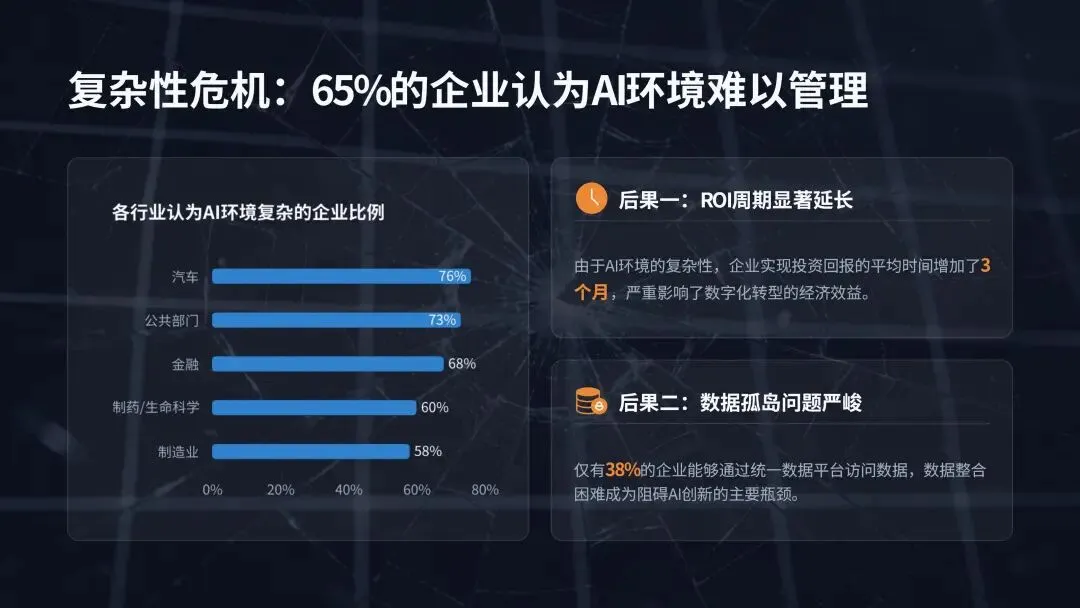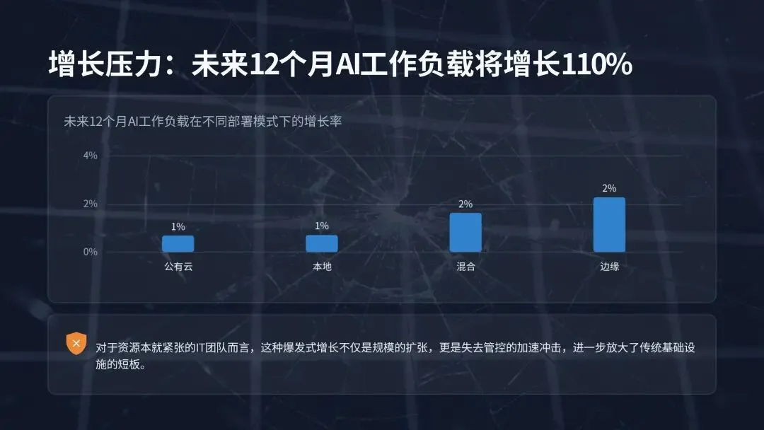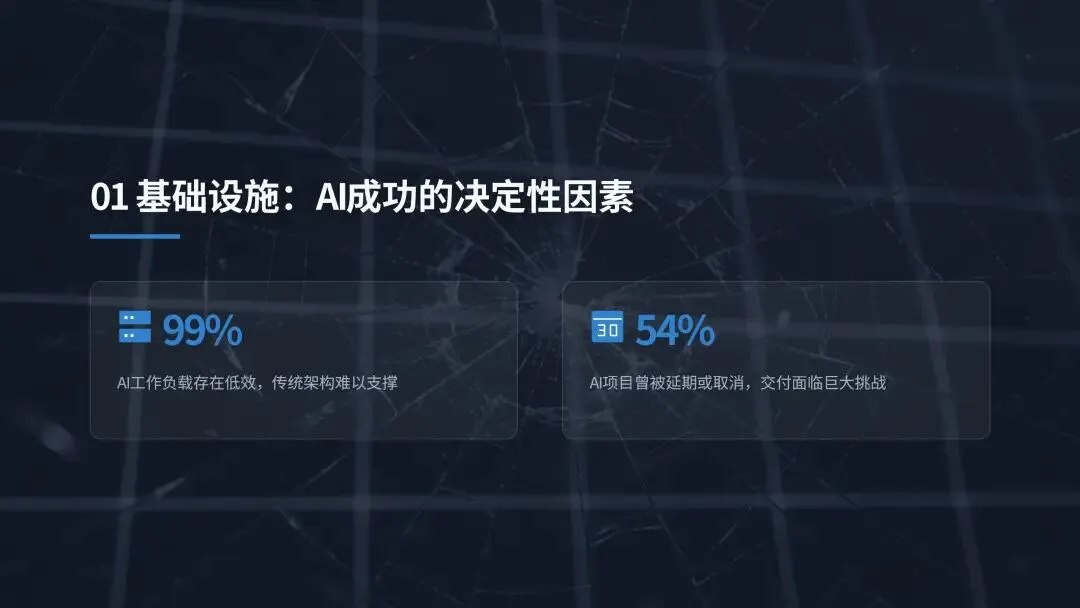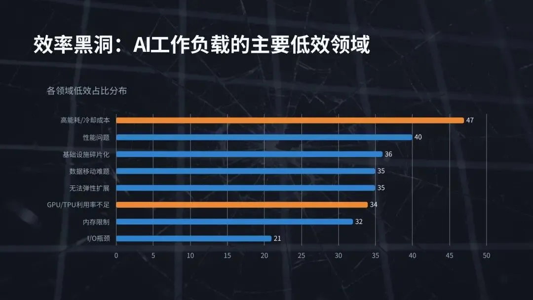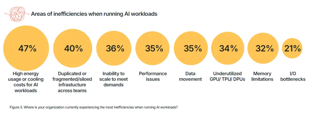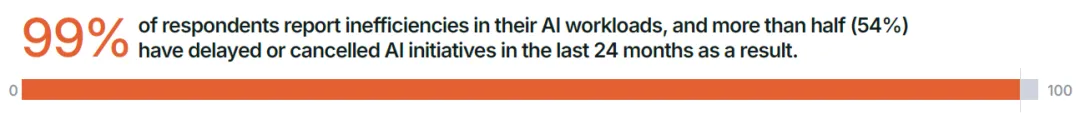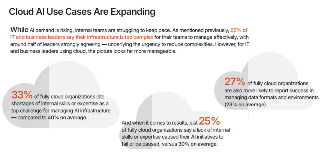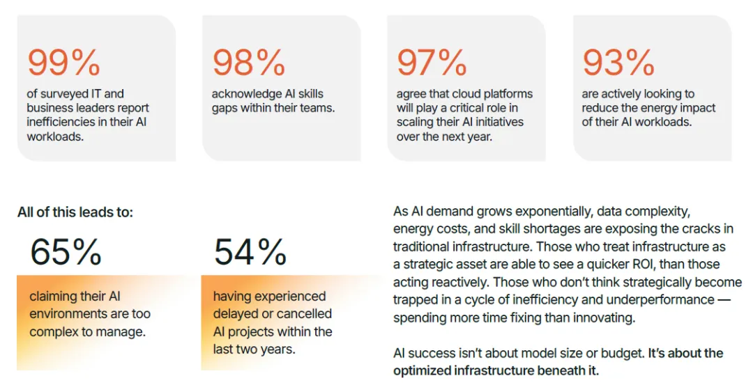 上述行业普遍存在的痛点,直接引发了两大核心后果:65% 的受访者表示自身的 AI 环境过于复杂,团队已难以有效管理;54% 的企业在过去两年内出现过 AI 项目延期或直接取消的情况。随着 AI 需求呈指数级增长,数据复杂性攀升、能源成本高企、专业人才短缺三大问题,正持续暴露传统 IT 基础设施的底层缺陷。调研证实,将基础设施视为战略资产的企业,能比被动应对的企业更快实现 AI 投资回报;而缺乏战略性基础设施规划的企业,将陷入效率低下与业绩不达预期的恶性循环,最终将大部分时间耗费在系统故障修复而非技术创新上。AI 技术的发展速度已远超支撑其运行的传统系统迭代速度,基础设施的复杂性直接拖慢了 AI 投资回报的兑现节奏,成为企业 AI 规模化落地的核心胜负手。65% 的受访领导者明确承认,其企业的 AI 环境对团队而言已过于复杂,难以有效管理。这种复杂性带来的直接影响是,相关企业实现 AI 投资 ROI 的时间平均额外增加 3 个月,全行业 AI 基础设施投资的平均 ROI 兑现周期长达 14 个月。复杂性痛点在不同行业呈现出差异化的突出特征,其中汽车行业与其他未单独列示的私营领域,均有 76% 的受访者认为 AI 环境管理难度过高,公共部门为 73%,金融行业为 68%,制药与生命科学行业为 60%,制造业为 58%。具体来看,汽车与制造业面临海量传感器与仿真数据对传统系统的冲击,公共部门受困于治理规则与系统互操作性难题,金融行业需满足合规与风险管理的实时数据需求,即便是数据驱动属性极强的生命科学行业,也面临 AI 研究的速度与规模超出传统基础设施承载能力的困境。(二)AI 工作负载爆发式增长加剧基础设施承载压力未来 12 个月,全行业 AI 工作负载整体将增长 110%,不同部署模式的增长幅度呈现显著分化,其中边缘部署增长 227%,混合部署增长 162%,本地部署增长 70%,公有云部署增长 68%。这种爆发式的增长,对于本就资源紧张、能力承压的 IT 团队而言,不仅是规模扩张,更是失去管控的加速冲击,进一步放大了传统基础设施的短板。全行业 99% 的企业,即便是技术能力最领先的机构,都报告其 AI 工作负载中存在效率低下问题,这些问题持续消耗企业的预算、能源与生产效率。从诱因来看,76% 的决策者面临至少一项基础数据挑战,包括数据孤岛、数据集不可访问、无节制的云资源扩张等;65% 的受访者面临至少一项与传统系统相关的挑战,包括对过时基础设施的依赖、无法根据业务需求实现弹性扩展。除此之外,高能耗与冷却成本、跨团队基础设施重复建设与碎片化、CPU/GPU/TPU 资源利用率不足、内存限制、I/O 瓶颈等,均是行业普遍存在的低效痛点。从低效环节的分布来看,47% 的企业将高能耗与冷却成本列为首要低效问题,40% 存在工作负载性能问题,36% 存在跨团队基础设施重复建设或碎片化孤岛问题,35% 面临数据移动难题,35% 无法根据业务需求实现基础设施弹性扩展,34% 存在 GPU/TPU/DPU 利用率不足问题,32% 面临内存限制,21% 存在 I/O 瓶颈。这些效率问题带来的商业后果极为显著:54% 的企业在过去两年内出现过 AI 项目延期或取消的情况,而数据碎片化、基础设施过度复杂的企业,出现项目失败的概率是其他企业的 2 倍。专为 AI 规模化、简洁性与效率打造的专用基础设施,是当前企业实现 AI 成功的最大单一驱动因素。调研证实,对传统碎片化系统进行改造以适配现代 AI 工作负载的模式,几乎无法实现预期效果,甚至会直接导致项目失败。真正实现 AI 规模化突破的企业,均选择简化架构而非持续叠加工具,核心动作包括:现代化改造数据管道、整合分散的数据孤岛、部署专用 AI 基础设施,将计算、存储与数据移动能力统一在一个智能层中,从底层架构解决复杂性与低效问题。云计算已成为现代 AI 基础设施不可或缺的核心底座,97% 的 IT 与商业领袖一致认为,云平台将在未来 12 个月的 AI 项目规模化中发挥关键作用。云平台让 AI 规模化从技术可行变为商业可落地,其提供的可扩展性、弹性能力与前沿技术工具访问权限,能够帮助企业有效管理基础设施复杂性、消除容量瓶颈、简化模型实验流程,核心价值体现在四大维度:- 简化 GPU 资源获取,企业无需自建和管理本地基础设施与数据中心,即可便捷获取 AI 所需的 GPU 算力资源;