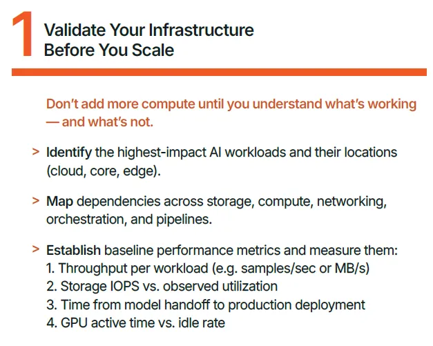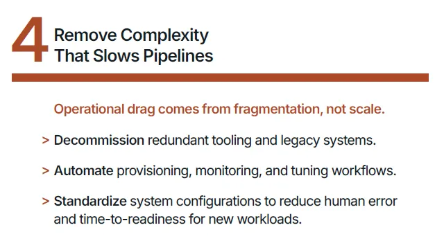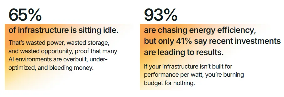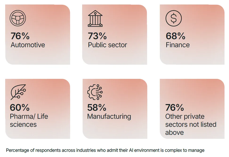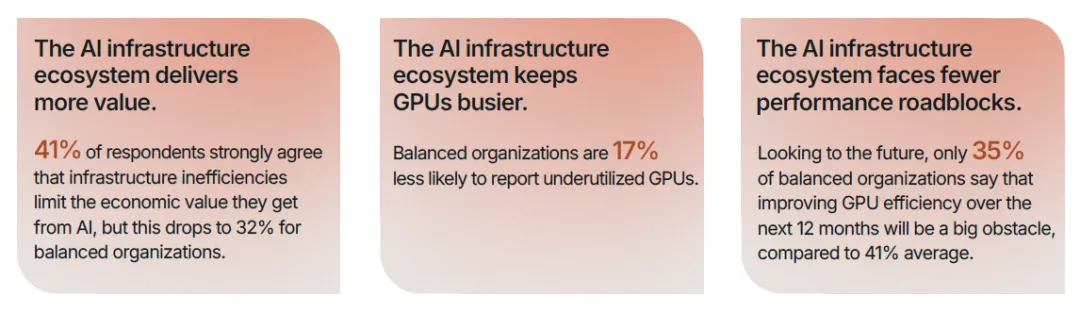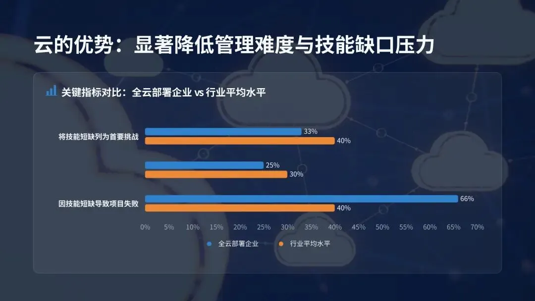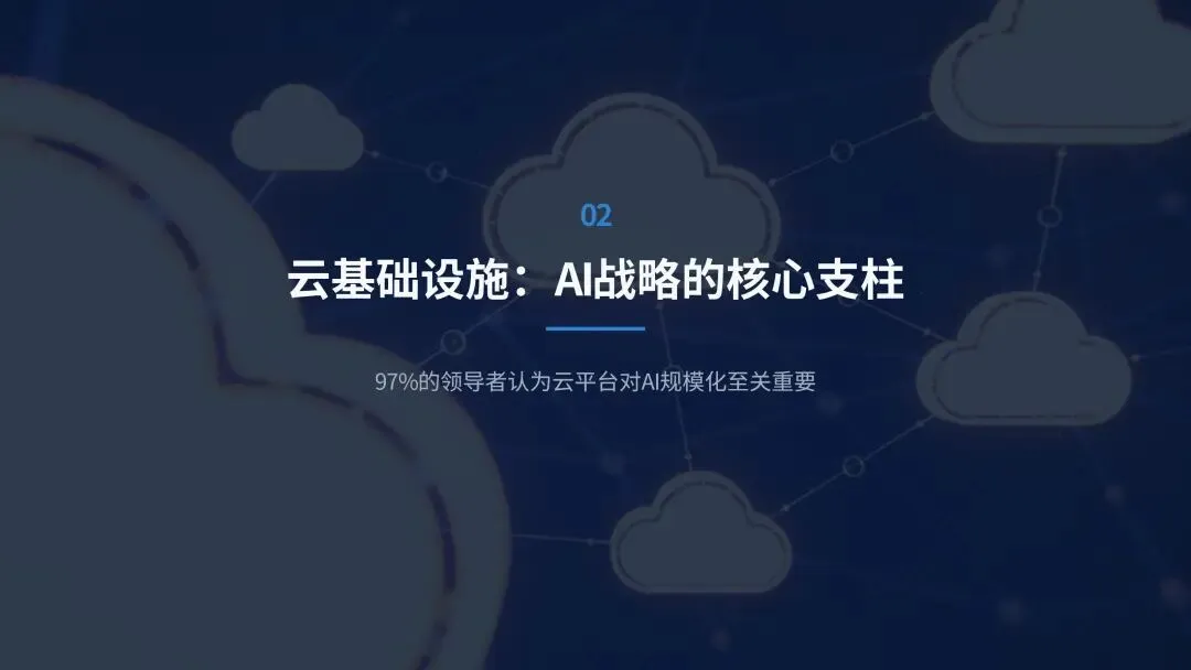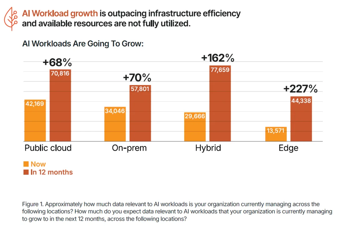 上述行业普遍存在的痛点,直接引发了两大核心后果:65% 的受访者表示自身的 AI 环境过于复杂,团队已难以有效管理;54% 的企业在过去两年内出现过 AI 项目延期或直接取消的情况。随着 AI 需求呈指数级增长,数据复杂性攀升、能源成本高企、专业人才短缺三大问题,正持续暴露传统 IT 基础设施的底层缺陷。调研证实,将基础设施视为战略资产的企业,能比被动应对的企业更快实现 AI 投资回报;而缺乏战略性基础设施规划的企业,将陷入效率低下与业绩不达预期的恶性循环,最终将大部分时间耗费在系统故障修复而非技术创新上。AI 技术的发展速度已远超支撑其运行的传统系统迭代速度,基础设施的复杂性直接拖慢了 AI 投资回报的兑现节奏,成为企业 AI 规模化落地的核心胜负手。65% 的受访领导者明确承认,其企业的 AI 环境对团队而言已过于复杂,难以有效管理。这种复杂性带来的直接影响是,相关企业实现 AI 投资 ROI 的时间平均额外增加 3 个月,全行业 AI 基础设施投资的平均 ROI 兑现周期长达 14 个月。复杂性痛点在不同行业呈现出差异化的突出特征,其中汽车行业与其他未单独列示的私营领域,均有 76% 的受访者认为 AI 环境管理难度过高,公共部门为 73%,金融行业为 68%,制药与生命科学行业为 60%,制造业为 58%。具体来看,汽车与制造业面临海量传感器与仿真数据对传统系统的冲击,公共部门受困于治理规则与系统互操作性难题,金融行业需满足合规与风险管理的实时数据需求,即便是数据驱动属性极强的生命科学行业,也面临 AI 研究的速度与规模超出传统基础设施承载能力的困境。(二)AI 工作负载爆发式增长加剧基础设施承载压力未来 12 个月,全行业 AI 工作负载整体将增长 110%,不同部署模式的增长幅度呈现显著分化,其中边缘部署增长 227%,混合部署增长 162%,本地部署增长 70%,公有云部署增长 68%。这种爆发式的增长,对于本就资源紧张、能力承压的 IT 团队而言,不仅是规模扩张,更是失去管控的加速冲击,进一步放大了传统基础设施的短板。全行业 99% 的企业,即便是技术能力最领先的机构,都报告其 AI 工作负载中存在效率低下问题,这些问题持续消耗企业的预算、能源与生产效率。从诱因来看,76% 的决策者面临至少一项基础数据挑战,包括数据孤岛、数据集不可访问、无节制的云资源扩张等;65% 的受访者面临至少一项与传统系统相关的挑战,包括对过时基础设施的依赖、无法根据业务需求实现弹性扩展。除此之外,高能耗与冷却成本、跨团队基础设施重复建设与碎片化、CPU/GPU/TPU 资源利用率不足、内存限制、I/O 瓶颈等,均是行业普遍存在的低效痛点。从低效环节的分布来看,47% 的企业将高能耗与冷却成本列为首要低效问题,40% 存在工作负载性能问题,36% 存在跨团队基础设施重复建设或碎片化孤岛问题,35% 面临数据移动难题,35% 无法根据业务需求实现基础设施弹性扩展,34% 存在 GPU/TPU/DPU 利用率不足问题,32% 面临内存限制,21% 存在 I/O 瓶颈。这些效率问题带来的商业后果极为显著:54% 的企业在过去两年内出现过 AI 项目延期或取消的情况,而数据碎片化、基础设施过度复杂的企业,出现项目失败的概率是其他企业的 2 倍。专为 AI 规模化、简洁性与效率打造的专用基础设施,是当前企业实现 AI 成功的最大单一驱动因素。调研证实,对传统碎片化系统进行改造以适配现代 AI 工作负载的模式,几乎无法实现预期效果,甚至会直接导致项目失败。真正实现 AI 规模化突破的企业,均选择简化架构而非持续叠加工具,核心动作包括:现代化改造数据管道、整合分散的数据孤岛、部署专用 AI 基础设施,将计算、存储与数据移动能力统一在一个智能层中,从底层架构解决复杂性与低效问题。云计算已成为现代 AI 基础设施不可或缺的核心底座,97% 的 IT 与商业领袖一致认为,云平台将在未来 12 个月的 AI 项目规模化中发挥关键作用。云平台让 AI 规模化从技术可行变为商业可落地,其提供的可扩展性、弹性能力与前沿技术工具访问权限,能够帮助企业有效管理基础设施复杂性、消除容量瓶颈、简化模型实验流程,核心价值体现在四大维度:- 简化 GPU 资源获取,企业无需自建和管理本地基础设施与数据中心,即可便捷获取 AI 所需的 GPU 算力资源;
