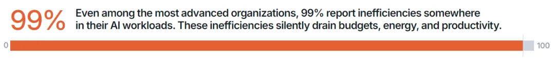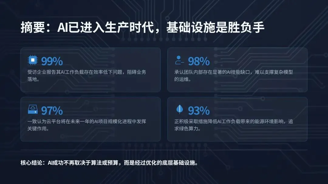 本报告基于 DDN 联合 Google Cloud、Cognizant 委托独立市场研究机构 Vanson Bourne 开展的专项调研形成,调研覆盖美国各行业 600 名 IT 与商业决策人,受访主体均为员工规模 1000 人以上的企业,核心覆盖金融、制造、汽车、公共部门、制药与生命科学等核心领域。调研核心结论明确:人工智能已全面进入生产落地时代,AI 项目成功的核心决定因素不再是算法、模型规模或预算投入,而是底层的 AI 基础设施能力。来源:DDN, State of AI Infrastructure Report 2026AI 技术的规模化落地已进入深水区,但支撑其运行的基础设施正成为绝大多数企业的核心瓶颈。调研数据显示,99% 的受访 IT 与商业领袖报告其 AI 工作负载存在效率低下问题,98% 承认团队内部存在显著的 AI 技能缺口,97% 一致认为云平台将在未来一年的 AI 项目规模化进程中发挥关键作用,93% 的企业正积极采取措施降低 AI 工作负载带来的能源环境影响。