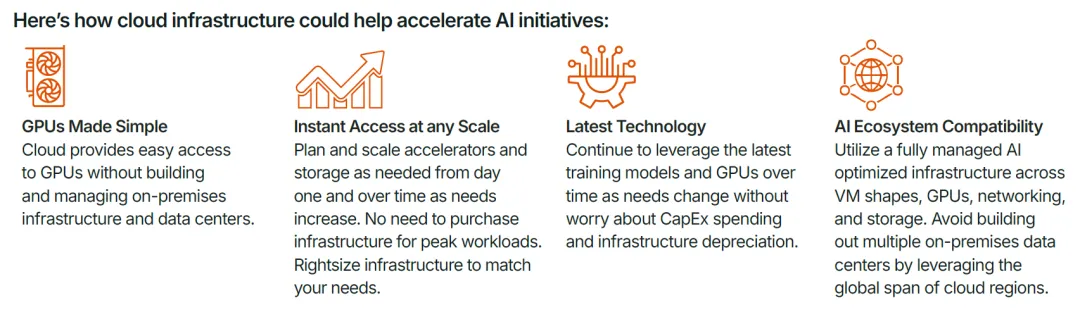 - 全链路适配 AI 生态系统,可利用云区域的全球覆盖能力,使用跨虚拟机规格、GPU、网络与存储的全托管 AI 优化基础设施,避免自建多个本地数据中心的高额成本与长周期问题。