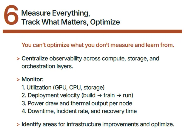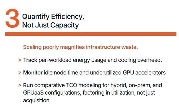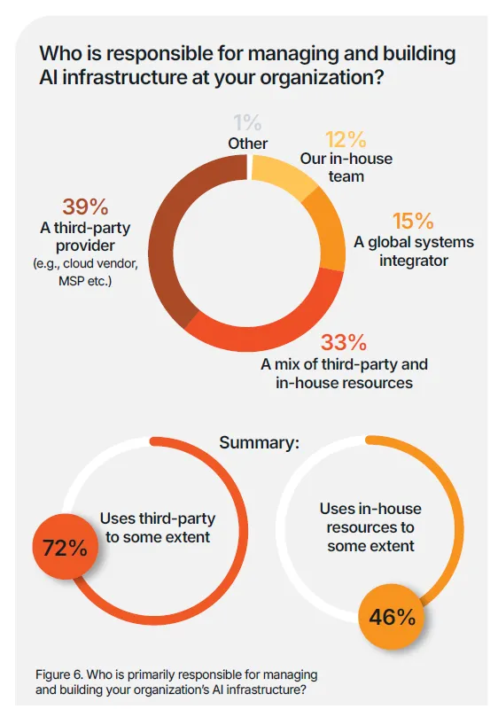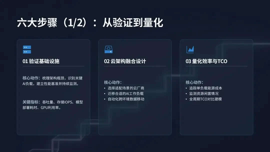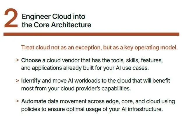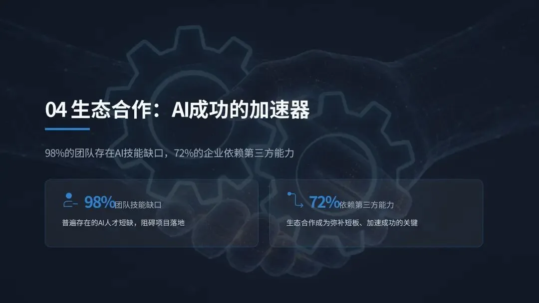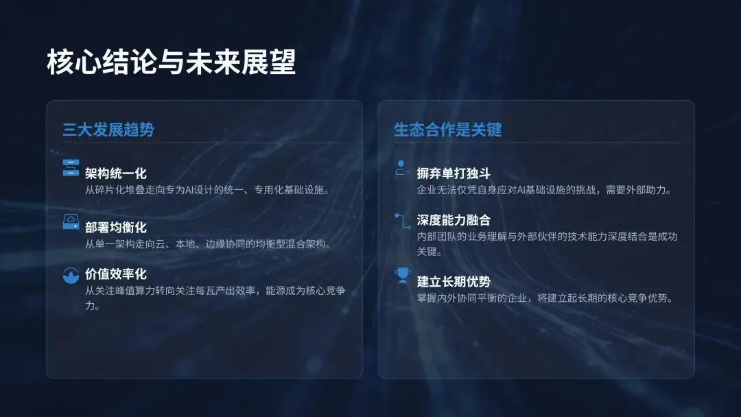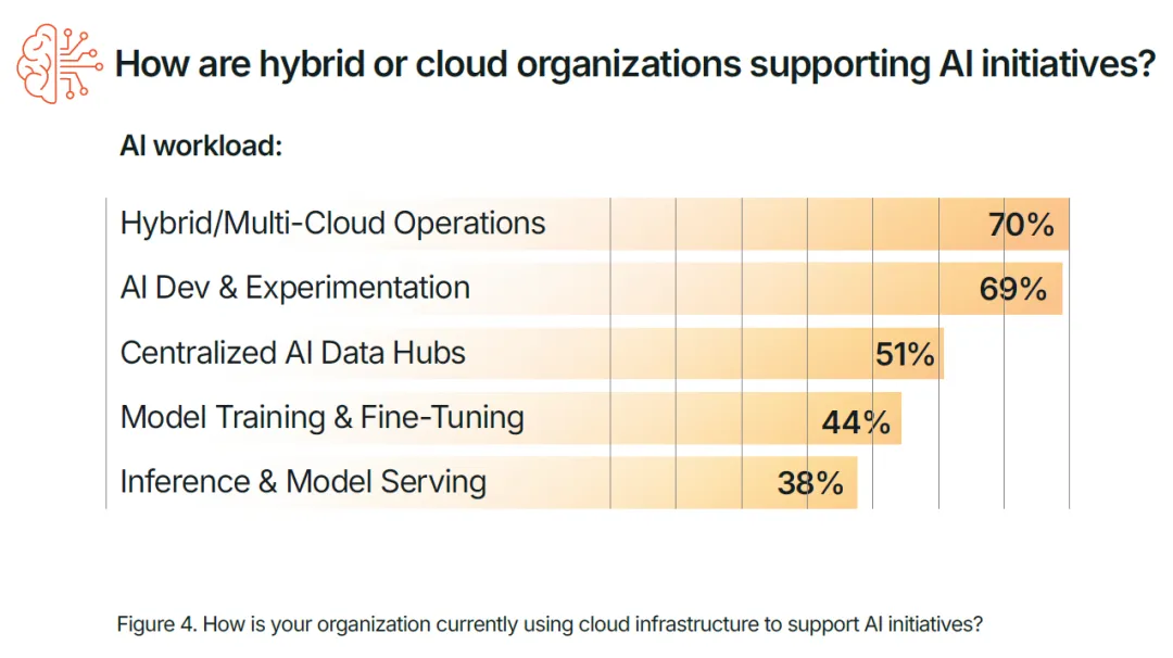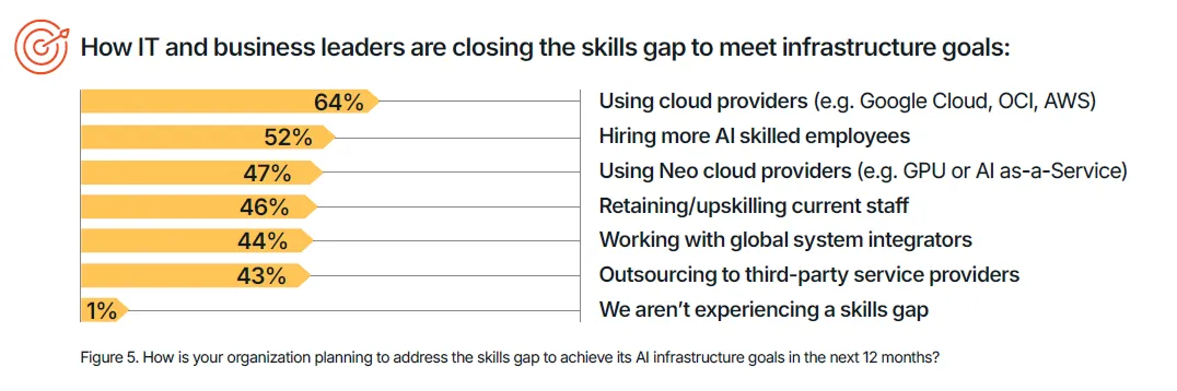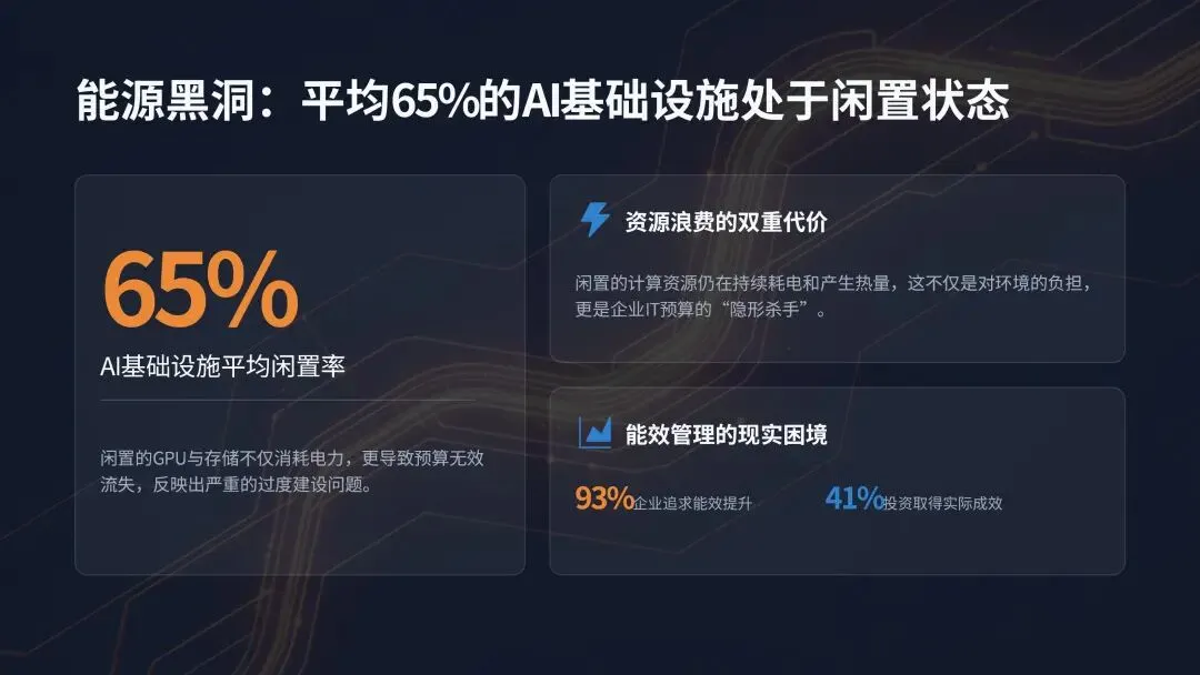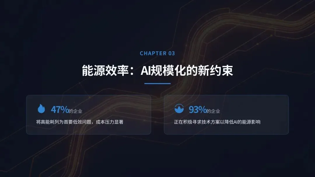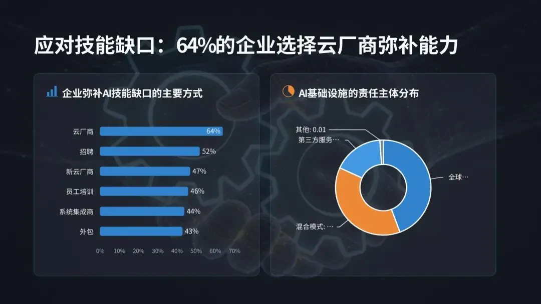 (二)云部署显著降低 AI 管理难度与技能缺口压力尽管全行业 65% 的企业表示 AI 基础设施过于复杂,团队难以有效管理,但全云部署的企业,其面临的挑战与项目失败风险显著低于行业平均水平。数据显示,33% 的全云企业将内部技能或专业人才短缺列为 AI 基础设施管理的首要挑战,低于行业平均的 40%;仅 25% 的全云企业表示,内部技能短缺导致其 AI 项目失败或暂停,低于行业平均的 30%;27% 的全云企业在数据格式与环境管理方面取得成功,高于行业平均的 23%;66% 的全云企业将其 AI 基础设施投资描述为战略性与前瞻性的,远高于行业平均的 40%。这一结果证实,云应用通过简化基础设施管理、降低运营复杂性,有效弥补了企业的 AI 技能缺口,让技术团队能够将工作重心从底层运维转向更具战略性的业务创新任务。当前企业对云基础设施的 AI 应用已形成规模化落地,70% 的受访者将云用于 AI 数据运营,69% 用于支持 AI 开发与模型实验,51% 用于搭建中心化 AI 数据枢纽与数据湖仓,44% 用于模型训练与微调,38% 用于模型推理与服务。随着 AI 技术的持续迭代,检索增强生成(RAG)、大规模模型推理等云 AI 应用场景,未来的普及度将进一步提升,成为云平台支撑 AI 落地的核心增量场景。企业必须将云作为 AI 基础设施战略的核心组成部分进行投资与应用,而非可选补充项。核心落地动作包括:选择针对企业自身 AI 应用场景,已构建配套工具、技能、功能与应用的云厂商;识别并将能最大程度发挥云厂商能力优势的 AI 工作负载迁移至云端;通过策略自动化跨边缘、核心与云端的数据移动,确保 AI 基础设施的资源利用率最优化。AI 的下一个规模化约束条件不再是计算能力,而是能源供给与利用效率。调研数据显示,近半数(47%)的受访者将能源使用与冷却成本列为 AI 工作负载的首要低效环节,93% 的企业正积极寻求降低 AI 工作负载的能源环境影响。随着 AI 训练与推理循环的持续不间断运行,数据中心的电力需求急剧攀升,行业诞生了全新的 AI 价值衡量标准:每瓦 AI 产出(也称为每瓦令牌数),即系统每单位能耗可产生的有效语言、商业洞察或决策能力,这一指标直接反映了基础设施将电力转化为智能的核心效率。国际能源署(IEA)发布的数据显示,全球数据中心的电力需求到 2030 年可能实现翻倍,这一增长趋势凸显了未来十年能源效率对于 AI 发展的核心地位。这不仅是企业的运营成本挑战,更是关乎行业发展的经济与环境挑战,基础设施的能源利用效率,将直接决定企业 AI 战略的规模化上限与可持续发展能力。调研数据显示,企业平均 65% 的 AI 基础设施处于闲置状态。闲置的 GPU 仍会持续消耗电力,闲置的存储设备仍需要配套冷却系统运行,这些闲置资源不仅造成了电力与存储能力的浪费,更直接证明多数企业的 AI 环境存在过度建设、优化不足的问题,持续造成企业预算的无效流失。尽管全行业 93% 的企业都在追求 AI 能源效率提升,但仅有 41% 的企业表示,近期在能源效率领域的相关投资取得了实际成效,凸显了行业 “重投入、轻效果” 的普遍困境。现代 AI 工作负载不再是规整、可预测的循环运行模式,而是持续、多阶段、数据密集型的不间断运行,需要计算、内存与存储之间的持续协同,因此能源效率无法在架构搭建后补充优化,必须从设计阶段就融入基础设施的底层架构中。能源感知型基础设施可通过三大核心方式实现降本增效:保持 GPU 的充分利用率,避免其因数据等待出现闲置空耗;以匹配 GPU 运算的速度并行移动数据,消除数据传输带来的算力空窗;跨工作负载与数据中心设施动态管理电力与冷却资源。通过上述方式,企业可实现更高的资源利用率、更低的总体拥有成本与可量化的可持续发展收益,在电力供给决定增长上限的时代,从每千瓦电力中挖掘更多的 AI 商业价值。AI 的发展不仅依赖基础设施,更依赖专业人才的支撑,但全行业普遍存在的 AI 技能缺口,已成为企业规模化落地的核心阻碍,而生态合作正是企业弥补能力短板、加速 AI 落地的核心路径。98% 的 IT 与商业领袖承认其团队存在 AI 相关技能缺口,83% 的企业表示团队当前已在 AI 工作负载管理中面临显著困难,68% 的企业承认未来 6 个月内尚未做好管理 AI 工作负载的准备,即便到一年之后,仍有 65% 的企业无法做好相关准备。出现这一困境的核心原因在于,传统 IT 职能是为数据库、应用程序、网络等可预测的标准化系统设计的,无法适配现代 AI 持续、数据密集型的工作流模式。外部行业研究同样印证了这一挑战的严峻性:65% 的企业因技能短缺直接放弃了 AI 项目,68% 的企业高管表示其企业存在中度至重度的 AI 技能赤字。面对普遍存在的技能缺口,企业采取了多元化的应对措施,其中 64% 的企业选择通过云厂商(如 Google Cloud、OCI、AWS)弥补能力缺口,52% 计划招聘更多具备 AI 专业技能的员工,47% 选择使用新型云厂商(如 GPU 或 AI 即服务提供商),46% 计划对现有员工进行保留与技能提升,44% 选择与全球系统集成商合作,43% 选择将相关业务外包给第三方服务提供商,仅有 1% 的企业表示未面临 AI 技能缺口。大多数企业已认识到,外部专业能力不是应对技能缺口的权宜之计,而是 AI 时代的战略赋能工具。调研数据显示,72% 的企业依赖第三方专业能力搭建和管理 AI 基础设施,仅有 12% 的企业完全依靠内部团队完成相关工作。从责任主体分布