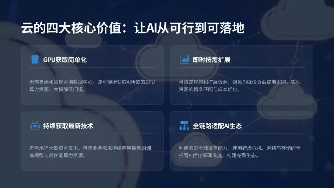 - 持续获取最新技术,无需承担大额资本支出与基础设施折旧风险,可随业务需求变化,持续应用最新的训练模型与 GPU 算力资源;