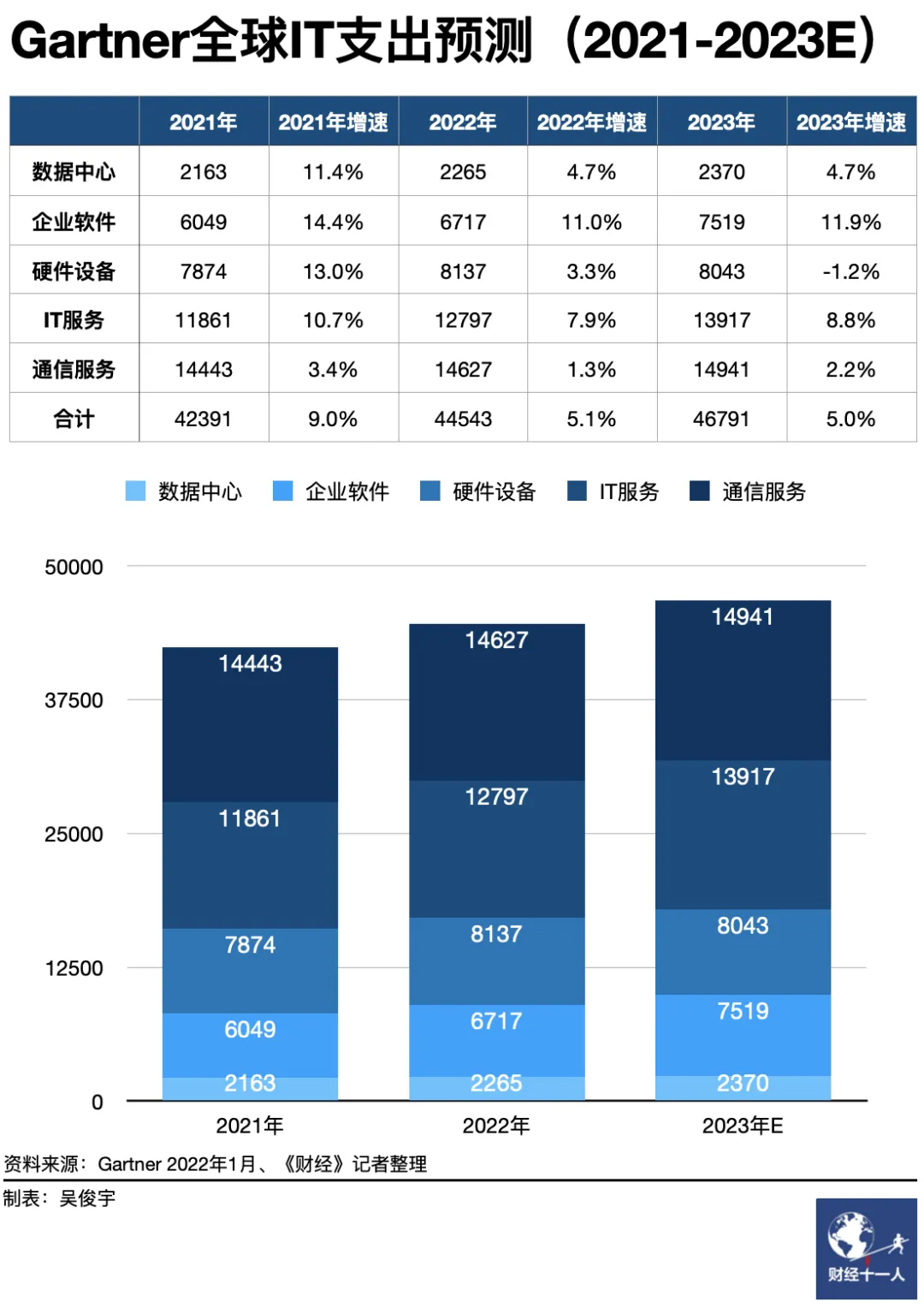 今年初,国际调研公司Gartner公布数据预测称,2022年全球IT支出预计将达到4.5万亿美元,同比增长5.5%,增速和2021年相比略有下滑。全球IT支出的大盘看似不乐观,但从消费结构来看,IT服务和企业软件仍然是增速最快的部分。全球IT服务中的业务和技术咨询支出2022年预计涨幅仍将达到10%。