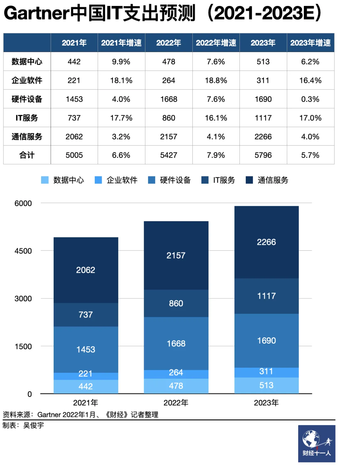 2022年中国IT支出预计将突破5400亿美元,同比增长7.9%,相比2021年增速仍有上涨。中国的IT服务和软件市场增速甚至接近20%。