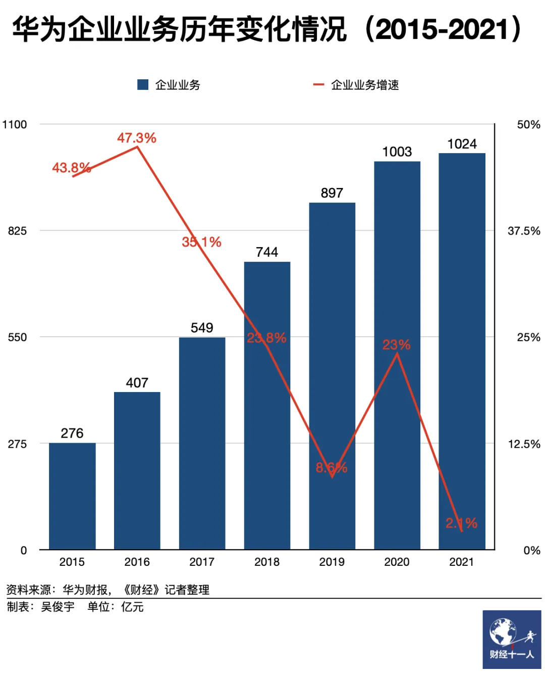 华为企业BG在今年其实也进入了一个关键的攻坚期。华为2021年报数据显示,企业业务收入为1024亿元,占总营收16.1%,同比增长2.1%,是华为三大业务中仍保持增长的板块。