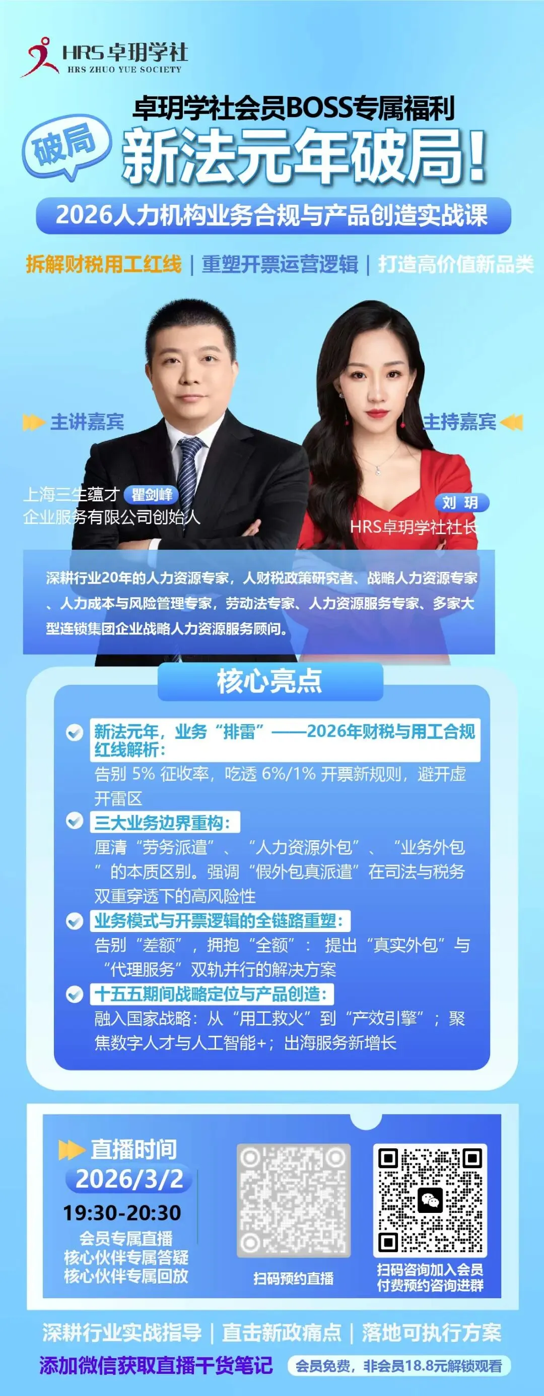 三大业务边界重构:结合财税〔2026〕10号公告及《劳动争议司法解释二》,厘清“劳务派遣”、“人力资源外包”、“业务外包”的本质区别。强调“假外包真派遣”在司法与税务双重穿透下的高风险性,以及社保、个税、发票三流不合一的虚开风险。