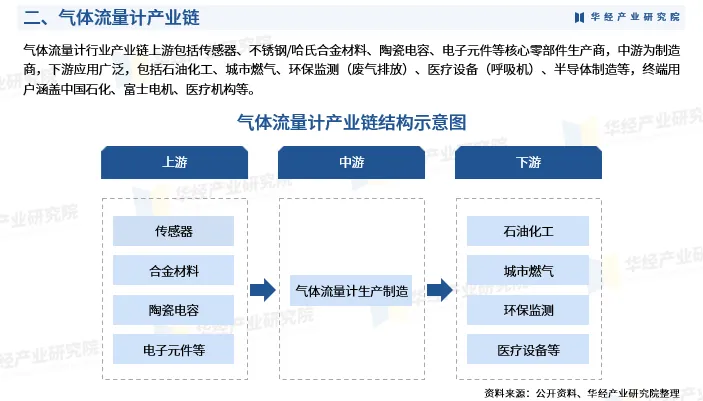 气体流量计行业产业链上游包括传感器、不锈钢/哈氏合金材料、陶瓷电容、电子元件等核心零部件生产商,中游为制造商,下游应用广泛,包括石油化工、城市燃气、环保监测(废气排放)、医疗设备(呼吸机)、半导体制造等,终端用户涵盖中国石化、富士电机、医疗机构等。