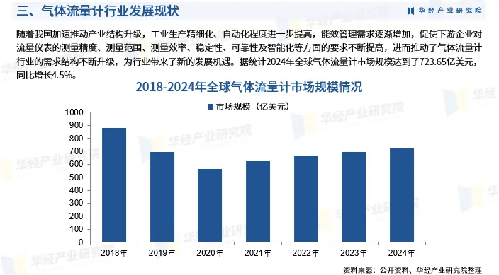 随着我国加速推动产业结构升级,工业生产精细化、自动化程度进一步提高,能效管理需求逐渐增加,促使下游企业对流量仪表的测量精度、测量范围、测量效率、稳定性、可靠性及智能化等方面的要求不断提高,进而推动了气体流量计行业的需求结构不断升级,为行业带来了新的发展机遇。据统计2024年全球气体流量计市场规模达到了723.65亿美元,同比增长4.5%。