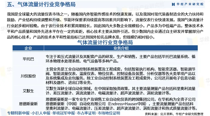 我国是全球最大的流量仪表市场之一,随着国内外智能传感技术的快速发展,以及我国对现代装备制造业的大力扶持和鼓励、产业结构持续调整和升级、节能环保要求持续提高等因素共同影响下,流量仪表行业快速发展。我国气体流量计行业起步相对较晚。由于该行业技术积累周期较长,因此国内大多数企业规模较小,产品多为中低端产品,整体技术水平和产品质量和国外先进水平存在一定的差距,核心技术主要从国外引进。仅少数国内企业通过自主研发并掌握部分产品的核心技术,产品的技术水平和性能指标已达到国外知名品牌水准,但规模仍相对较小。