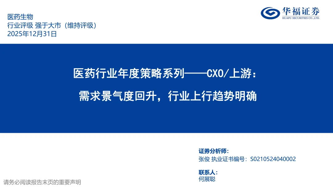 关注我们,后台回复“202602254”就可以获取《华福证券:医药行业年度策略系列——CXO/上游:需求景气度回升,行业上行趋势明确》(完整版) 的全文下载链接。