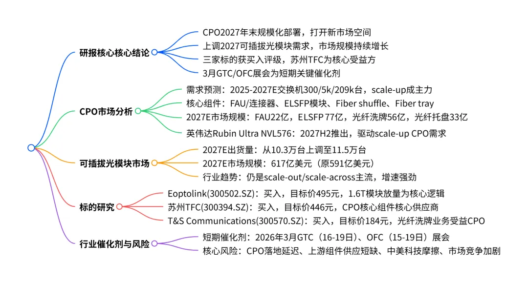 2026 年 2 月 23 日花旗发布中国通信基建行业研报,指出CPO 将于 2027 年末规模化部署,2027 年 CPO 交换机总需求达 20.9 万台(含_scale-up_16.9 万台、scale-out_4 万台),带动 FAU / 连接器等核心组件市场规模大幅增长,其中 FAU / 连接器达 22 亿美元、ELSFP 模块 77 亿美元;同时上调 2027 年可插拔光模块出货量至 11.5 万台,市场规模达 617 亿美元。研报给予Eoptolink、苏州 TFC、T&S Communications三只标的买入评级,认为苏州 TFC 是 Nvidia CPO 时代核心受益标的,3 月 GTC 和 OFC 展会成关键催化剂,同时提示了行业技术落地延迟、市场竞争等风险。