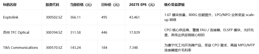 Eoptolink 2026/27E EPS 上调 40%/52%;苏州 TFC 2027E EPS 上调 19%;T&S Communications 小幅下调 2026E EPS(3%)、上调 2027E EPS(2%)。