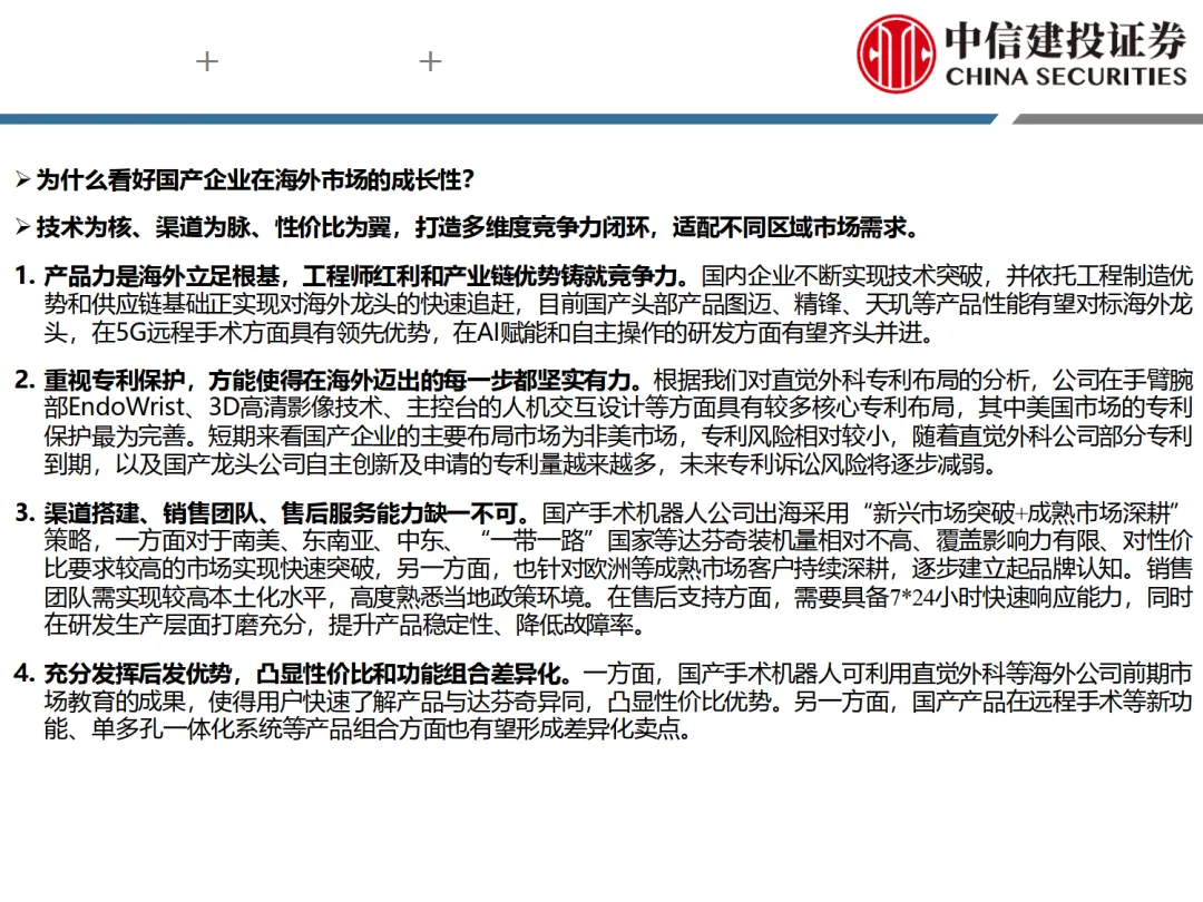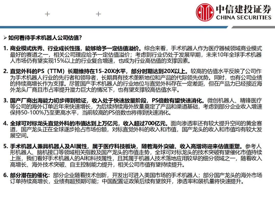 手术机器人是医疗器械领域最好的商业模式之一,设备装机后将带动耗材持续放量,形成稳定的收入和现金流。全球可对标龙头直觉外科已超过10000亿元市值,且渗透率及市场规模仍有较大增长空间。海外龙头 凭借先发优势占据市场主导地位,国产龙头加速推进产品迭代,性能已接近全球领先水平,在远程手术方面有所 领先,出海业务已占大部分收入比例且持续高增长,收入和市值均有数倍增长空间。我们认为,AI有望赋能手术 机器人实现自主操作,进一步辅助或替代医生的部分手术操作流程,利好行业渗透率和相关公司估值提升。
