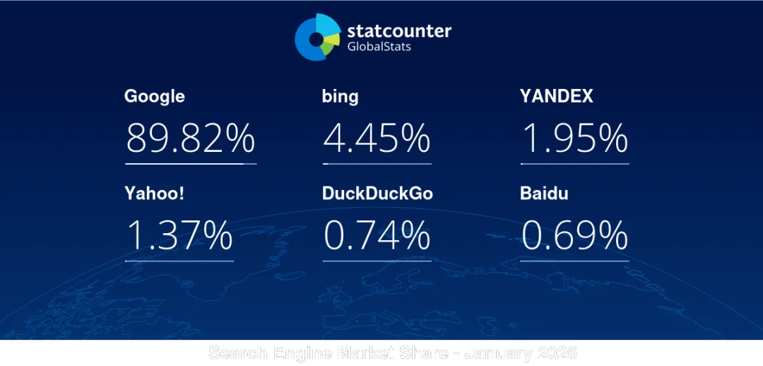 根据Statcounter 2026年1月官方监测数据,全球搜索引擎市场呈现高度集中态势: