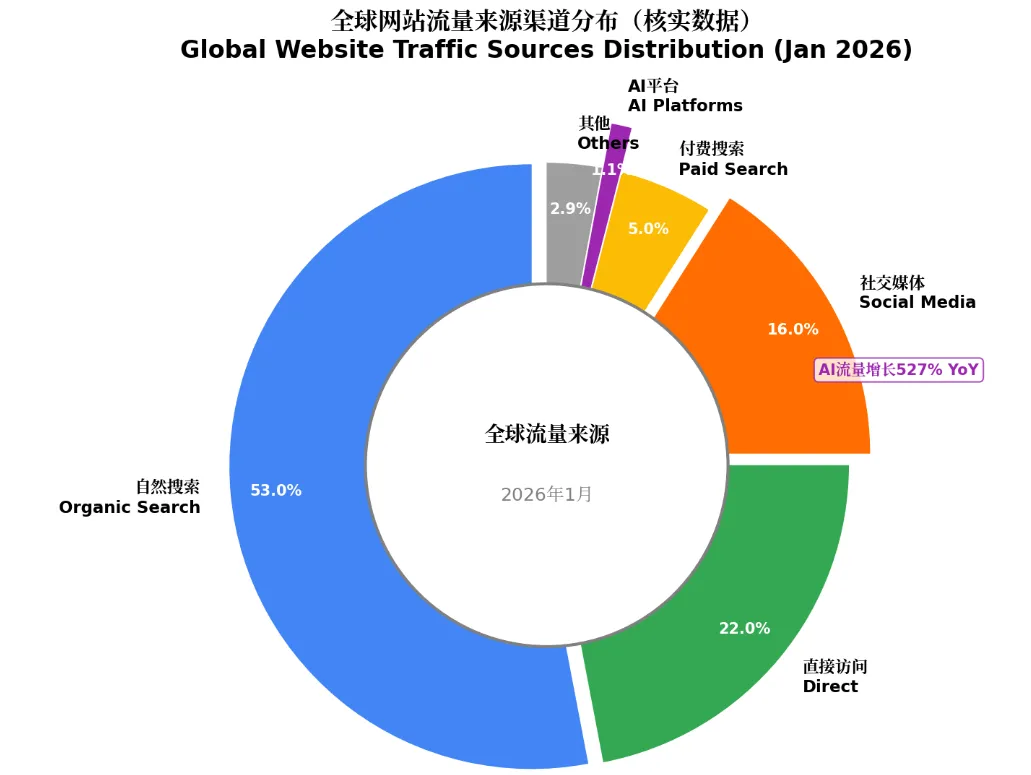 流量来源:自然搜索53%、直接访问22%、社交媒体16%、AI平台1.08%