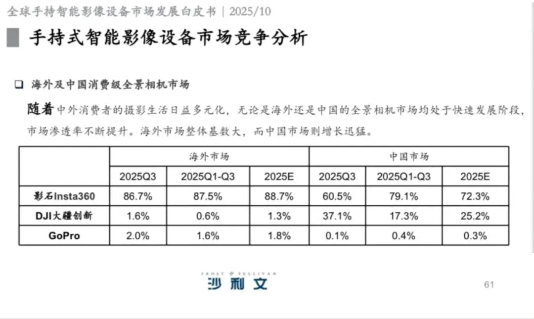 弗若斯特·沙利文数据显示,公司已连续八年位居全球全景相机市场份额第一;2025年第三季度市占率高达75%,主导了全球消费级全景相机赛道。
