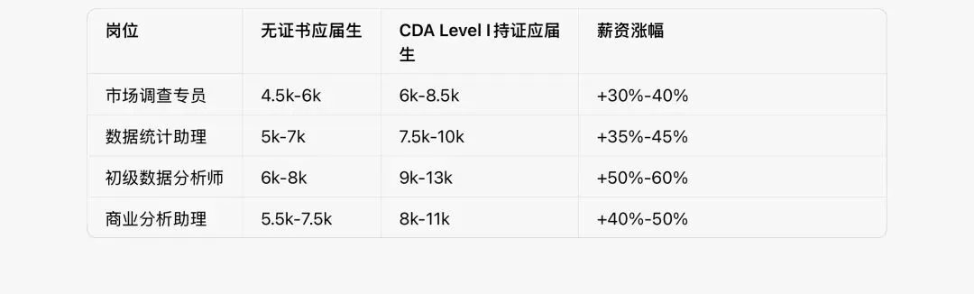 聚焦线下调研、用户访谈、竞品分析、报告撰写,适合深耕传统市场研究、咨询公司的同学,夯实业务落地能力。二、CDA持证vs无证书:薪资对比一目了然