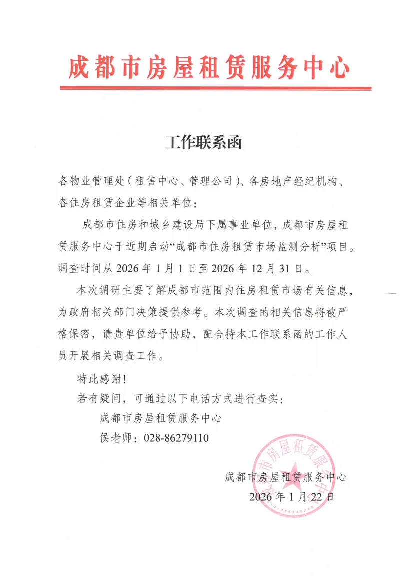 我们受成都市房屋租赁服务中心委托,正开展2026年2月成都市住房租赁市场调研工作。您的真实反馈对于完善我市租房政策、优化租赁服务环境具有重要意义。