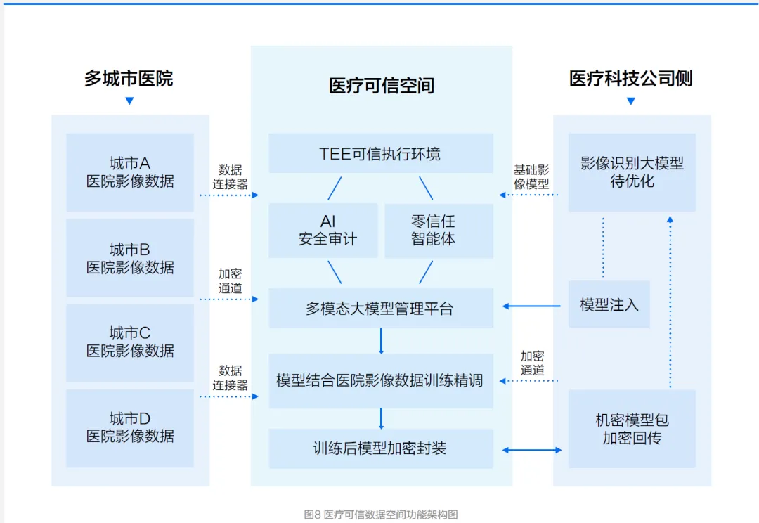 在可信数据空间里,三家的数据可以"锁在本地",但AI模型可以"上门学习"——模型分别去三家医院"看"数据,学习规律,带走的是"知识",不是"数据"。