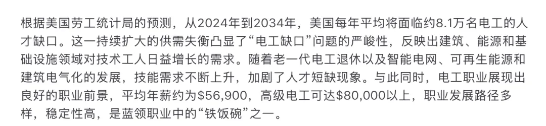 另外,AI可能替代了很多行业,但也催生出巨大的需求,星辰大海了半天,现在美国电力系统出现电工缺口……